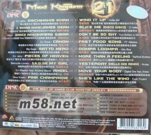 CD1 01 DJ Jerry/Dschinghis Khan 華人電音天王"羅百吉"最新超強(qiáng)獨(dú)家電音 成吉思汗 02 DJ Ross/[I WANNA KNOW]James Dean "小豬羅志祥"最新專(zhuān)輯精舞門(mén)翻唱原曲給你不同感受 精舞門(mén)原曲 03 Gibar/[DANCE REMIX]Hawaii Gibar Channa[V]人氣動(dòng)畫(huà)"Gibar"跨越歌壇首支出道單曲"舞曲混音版" 檀島Gibar 04 DJ Dove/Canon 傳唱最多古典曲卡農(nóng)獨(dú)家歌劇電音舞曲版 電音卡農(nóng) 05 Big Eagle/Gatto Nero 縱橫義大利以及日本人氣同謠獨(dú)家電音版全球造成轟動(dòng) 小黑貓 06 DJ Jerry/Pieces Of Heaven 電音天王"羅百吉"最新力作讓你再度感受羅氏電音魅力 天堂一角 07 Bermuda Loverz/[La DI DA]My Girl 德國(guó)舞曲排行黑馬最新單曲快樂(lè)向前走 啦滴答女孩 08 DJ Aligator feat.Kristine Blond/Angel 超級(jí)DJ"鱷魚(yú)先生"最新感人飆淚勸思舞曲震撼人心 天使 09 Nina Kristin/Pink Champagne 德國(guó)性感甜心天后"妮娜克莉絲汀"最新推出性感歌曲 粉紅香檳 10 Holla Girl/Wind It Up "關(guān)于史蒂芬"最新單曲新點(diǎn)子獨(dú)家版本不同凡響 甜蜜開(kāi)關(guān) 11 O Heller/Slice Me (Disco Disco) 德國(guó)舞曲榜電挫Electro新曲竄升速度飛快 迪斯可迪斯可 12 Foxy Brothers vs.Moti Special/Don't Be So Shy 80歐舞代表性歌曲07年最新電挫舞曲版好正 別太害羞 13 FF Allstars/Fast Food Song 俏皮可愛(ài)唱遍所有連鎖速食減肥運(yùn)動(dòng)最佳主題曲 速食歌 14 Uke Boy/Oompa Loompa 德國(guó)俏皮歐陸舞曲風(fēng)格熱鬧無(wú)比讓人快樂(lè) 嗚巴魯巴 15 Stafford Brothers/More Than A Feeling 澳洲Top 10 DJ團(tuán)體歐式舞曲讓你舞不停 超越這感覺(jué) 16 Anjay/Yesterday (Mello Dee Remix) 加拿大舞曲新天后最新單曲感動(dòng)你想跳舞的心 昨天 17 Dighital One feat.Krista/Move Your Body 取樣70年代迪斯可Let's All Chant副歌再創(chuàng)舞曲新風(fēng)潮 舞動(dòng)你的身體 18 Fcuk! Project/She's Like The Wind "熱舞17"主題曲獨(dú)家電音版讓你深情又激動(dòng) 她像一陣風(fēng) CD2 THE BEST OF DANCE CLUB NONSTOP MEDLEY 最佳派對(duì)決選連續(xù)混音組曲 01 Hawaii Gibar [DANCE REMIX]/檀島Gibar 02 Dschinghis Khan/成吉思汗 03 Pieces Of Heaven/天堂一角 04 Canon/電音卡農(nóng) 05 Gatto Nero/小黑貓 06 My Girl (La Di Da)/啦滴答女孩 07 Angel/天使 08 She's Like The Wind (Club Mix)/她像一陣風(fēng) 09 Wind It Up/甜蜜開(kāi)關(guān) 10 James Dean (I Wanna Know)/精舞門(mén)原曲 11 Pink Champagne/粉紅香檳 12 Fast Food Song/速食歌 13 Oompa Loompa/嗚巴魯巴 14 Slice Me (Disco Disco)/迪斯可迪斯可 15 Don't Be So Shy/別太害羞 16 More Than A Feeling/超越這感覺(jué) 17 Move Your Body/舞動(dòng)你的身體 18 Yesterday (Mello Dee Remix)/昨天