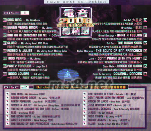 DISC 1 1.DING DING -DJ WICBONE 叮咚 德國超級臺式舞曲重見天日發行 2.SEUEN YEARS AMOR-DJ JERRY 七年之戀華人電音教父 羅百吉 最新超強單曲 3.MAI HA HI [DRAGOSTEA DIN TEI]-O-ZONE 嘜啊嘻紅遍全球單曲 賣啊嘻 賣啊猴 原唱收錄 4.ALLUBA -DJ JERRY FEAT.MC ELVIS 啊魯巴 羅百吉 紅翻全省舞廳電音國歌讓你舞力源源不絕 5.ROMEO&JULIET DJ JERRY FEAT MISSY BABE 羅密歐與茱麗葉 全省電音家族票選最深情電音舞曲 6.1000YEARS -DJ JERRY 一千年 羅百吉 出神電音必殺國歌 7.PARTY FOREVER -JAYS ON E 永遠派對 德國硬式快樂舞曲不同凡響 8.10000 LOVERS -DJ JERRY 一萬個戀人 羅百吉 搖滾電音最佳舞曲 9.DJ JET大風吹 臺灣電音小天王橫掃全省夜店單曲再度收錄 大風吹 10.DRIENTALIZE- 駝鈴 華人電音大師重 刀郎 暢銷曲獨家電音混音版 駝鈴 11.GLOBAL DEE JAYS WHAT A FEELING 全球DJ們 首支德國舞曲榜6周冠軍炫風單曲 閃舞 12.DJ DAZ-THE WOAH SONG 英國超強 -DJ 大支 成名超級單曲 喔喔喔(泰山男孩) 13.GLOBAL DEE JAYS-THE SOUND OF SAN FRANCISCO 德國舞曲榜6周冠軍行別收錄德文版 舊金山之聲 14.JAVA-DON'T PHUNK WITH MY HEART 即將來臺演唱 黑眼豆豆暢銷單曲獨家電音版式 別耍我的心 15.DISCO BADE KNOCK ON WOOO 全歐冠軍經典迪斯可舞曲電音版 敲木頭 16.TONIC & SERENIFY DOWNHILL DRNCING 德國銷售冠軍電音派對必備舞曲 越跳越瞎 DISC 2 1.DING DING -DJ WICBONE 叮咚 2.SEUEN YEARS AMOR-DJ JERRY 七年之戀 3.PARTY FOREVER -JAYS ON E 永遠派對 4.ROMEO&JULIET DJ JERRY FEAT MISSY BABE 羅密歐與茱麗葉 5.MAI HA HI [DRAGOSTEA DIN TEI]-O-ZONE 嘜啊嘻 6.駝鈴DRIENTALIZE- 駝鈴 7.THE WOAH SONG -DJ DAZ 喔喔喔(泰山男孩) 8.GLOBAL DEE JAYS WHAT A FEELING 閃舞 9.GLOBAL DEE JAYS-THE SOUND OF SAN FRANCISCO 舊金山之聲 10.ONE SECONO A STAR -RSTRADA 一秒一顆星 11.DON'T PHUNK WITH MY HEART-JAVA 別耍我的心 12. KNOCK ON WOOO -DISCO BADE 敲木頭 13.JUST ANOTHER DAY -RSTRADA 另一天 14. DOWNHILL DRNCING -TONIC & SERENIFY 越跳越瞎 15.大風吹 DJ JET大風吹 16.1000YEARS -DJ JERRY 一千年 17.10000 LOVERS -DJ JERRY 一萬個戀人 18.ALLUBA -DJ JERRY FEAT.MC ELVIS 啊魯巴