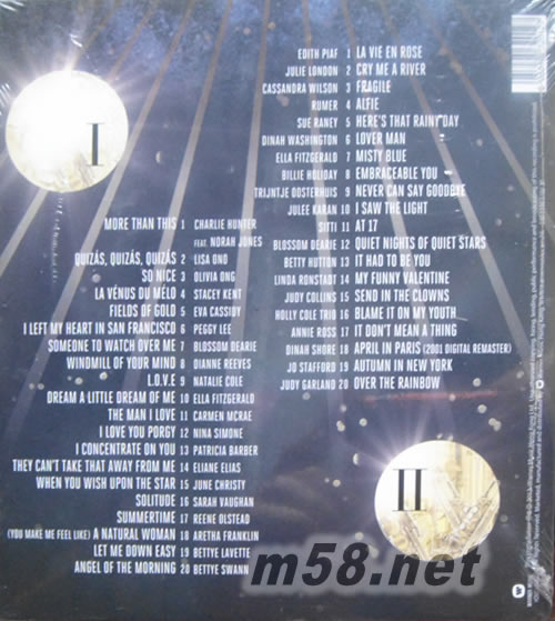 Disc 1 01. More Than This - Charlie Hunter featuring Norah Jones 02. Quizas Quizas Quizas - Lisa Ono 03. So Nice - Olivia Ong 04. La Venus du melo - Stacey Kent 05. Fields Of Gold - Eva Cassidy 06. I Left My Heart In San Francisco - Peggy Lee 07. Someone To Watch Over Me - Blossom Dearie 08. The Windmills Of Your Mind - Dianne Reeves 09. L.O.V.E - Natalie Cole 10. Dream A Little Dream Of Me - Ella Fitzgerald 11. The Man I Love - Carmen McRae 12. I Loves You Porgy - Nina Simone 13. I Concentrate On You - Patricia Barber 14. They Can't Take That Away From Me - Eliane Elias 15. When You Wish Upon A Star - June Christy 16. Solitude - Sarah Vaughan 17. Summertime - Renee Olstead 18. (You Make Me Feel Like) A Natural Woman - Aretha Franklin 19. Let Me Down Easy - Bettye LaVette 20. Angel of The Morning - Bettye Swann Disc 2 01. La Vie En Rose - Edith Piaf 02. Cry Me A River - Julie London 03. Fragile - Cassandra Wilson 04. Alfie - Rumer 5. Here's That Rainy Day - Sue Raney 06. Lover Man - Dinah Washington 07. Misty Blue - Ella Fitzgerald 08. Embraceable You - Billie Holiday 09. Never Can Say Goodbye - Trijntje Oosterhuis 10. I Saw The Light - Julee Karan 11. At 17 - Sitti 12. Quiet Nights Of Quiet Stars (Corcovado) - Blossom Dearie 13. It Had To Be You - Betty Hutton 14. My Funny Valentine - Linda Ronsdandt 15. Send In The Clowns - Judy Collins 16. Blame It On My Youth - Holly Cole 17. It Don’t Mean A Thing - Annie Ross 18. April In Paris - Dinah Shore 19. Autumn In New York - Jo Stafford 20. Over The Rainbow - Judy Garland