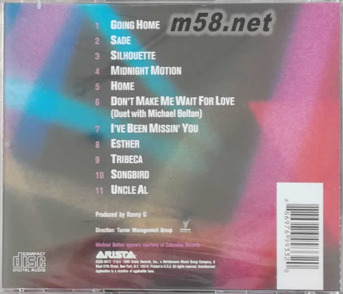 KENNY G LIVE 回家(m58.net) “肯尼G的現場音樂會”可能是賣得最多的唱片之一。這張唱片可以看作肯尼G歷年的音樂精選集,他最著名的曲子幾乎都在里面。而且在現場演奏,氣氛更加活躍,他和伴奏的樂手之間的配合很生動、活潑。最難得的是,現場錄音一般很難做得好,這個錄音是一個例外,音樂很有彈跳力,有現場錄音少有"水分"。而且音場的位置也很清晰。難怪曾經有一段時間,很多音響發燒友用它作試音唱片。