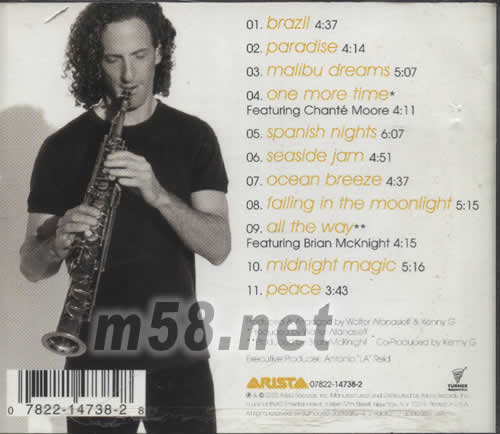 PARADISE(m58.net) 史上最成功的演奏家,繼創下Billboard排行榜流行榜榜首、葛萊美獎得主、全美音樂獎得主等多項唱片界記錄后,睽違3年2002最新登峰造極之作 KENNY G的音樂無處不在,歷久彌新,總也聽不厭。總是那么好聽。 此張專輯的最大亮點之一是第4首《ONE MORE TIME》KENNY G擁有一個很棒的樂隊、錄音、制作團隊,此曲與CHANTE MOORE小姐的演唱有天作之合!初聽起來只是一首不顯眼舒情爵士樂曲,聽到第三遍,味道才會全出來,哇,這位女士唱得如此溫柔,如此動人,與曲子配合得這么好,可以說水乳交融,另一方面又相得益彰,各自的特點又突出了! 盡管整張專輯的曲風、錄音都相當出色,但聽來聽去,最動人的還是這首《ONE MORE TIME》 “ONE MORE TIME ONE MORE MOMENT ONE MORE CHAT ONE MORE KISS……” 歌詞淺顯易懂,感覺這首歌是從心里流出來的,不是唱出來的。歌曲中速沉穩,但是歌者收放自如的演唱與薩克期完美的配合,使得聽起來激情蕩漾,真摯感人。如果你失戀了,或許憶起往日的一段情,這首歌會令你心碎,令你想起情人的吻,但同時它又有不可思議的療傷作用。 這是一張非常適合在車里,或是在茶館、咖啡館聽的專輯。