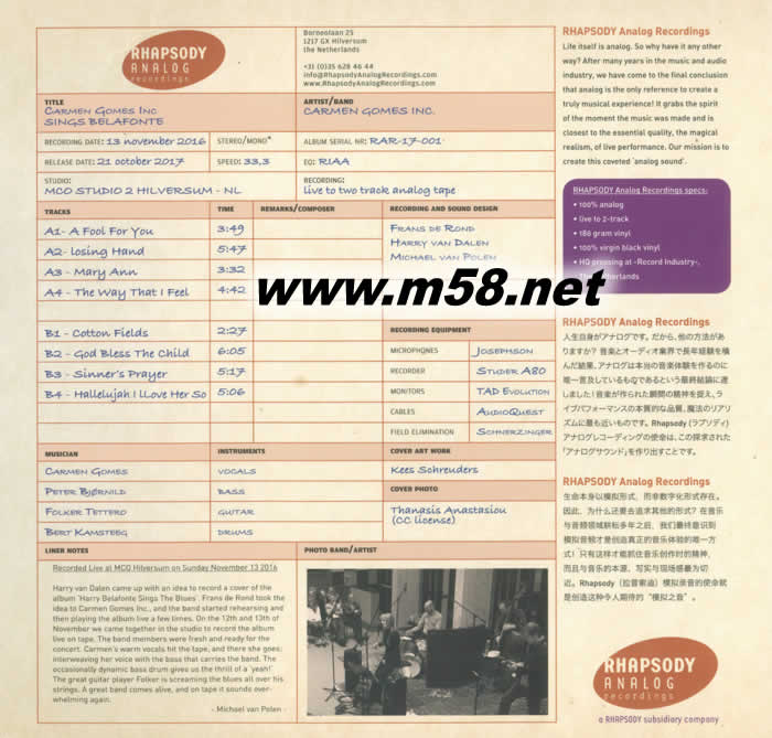 荷蘭最佳爵士女歌手 Carmen Gomes Inc Sings Belafonte 黑膠(m58.net) 荷蘭最佳爵士女歌手,爵士天后Carmen Gomes的嗓子細(xì)致晶瑩,,而在本碟內(nèi)不單有Carmen Gomes精彩的演出,還有負(fù)責(zé)Base Drumms 的 Marcel Van Engelen的精湛演出;他擊打Base Drums鼓,有著豐富的音樂感如在唱歌一般,極為動(dòng)聽,擊鼓力度之充沛,是其他的CD內(nèi)難以尋找得到,低音的音效結(jié)實(shí),絕無半點(diǎn)鬆散;鋼琴的細(xì)致點(diǎn)滴,豐富的立體感,準(zhǔn)確而清晰的定位,使整體的連結(jié)更加緊密。