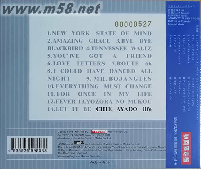 LIFE XRCD+SHMCD(m58.net) 日本爵士唯一天后綾戶智繪 經典金曲重新編曲詮釋 發燒級錄音XRCD 所有細節完整記錄! 日本爵士天后綾戶智繪和天王錄音師廣兼輝彥再度攜手合作,2011冬季最新錄音室專輯,將披頭四、Billy Joel等大師之作重新編曲,再加上獨家XRCD技術,呈現屬於綾戶智繪的特有風情。 一手包辦整張專輯鋼琴部分的綾戶智繪,第一首曲目就是Billy Joel的名曲「New York State of Mine」,綾戶智繪用極富節奏感的鋼琴彈奏,拉出一幅大蘋果的車水馬龍;「Amazing Grace」綾戶改為彈奏風琴,完完全全呈現黑人福音的精隨;「Bye Bye Blackbird」中隨興跟著鼓點的吟唱,讓人感到一股輕鬆自在的歡樂,最后用披頭四解散前的名曲「Let It Be」,歌曲中段加上唱詩班吟唱和聲,更是讓人意猶未盡,為這張在選曲以及錄音上都相當杰出的專輯,畫上完美句點!