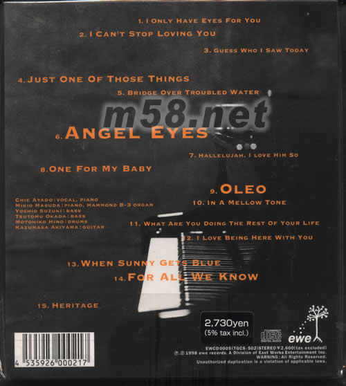 FOR ALL WE KNOW(日本版)(m58.net) 感性情歌(極級女聲天碟) 日本人氣爵士女歌手綾戶智繪演繹多首經典名曲。WHAT ARE YOU DOING THE REST OF YOUR LIFE柔柔的歌聲輕描出醉人的歌聲。發燒級錄制,突破出人聲的立體感及揮灑自如的唱腔。