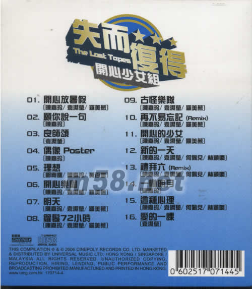 01. 開心放暑假 -陳嘉玲/袁潔瑩/羅美薇 02. 愿你說一句 -陳嘉玲 03. 良師頌 -袁潔瑩 04. 偶像 Poster -陳嘉玲 05. 理想 -鄧寄塵/陳嘉玲/黃百鳴 06. 開心樂園 -陳嘉玲/袁潔瑩/羅美薇 07. 明天 -陳嘉玲/袁潔瑩/羅美薇 08. 籮卷72小時 -陳嘉玲/袁潔瑩/羅美薇 09. 古怪樂隊 -陳嘉玲/袁潔瑩/羅美薇 10. 再不易忘記(Remix) -陳嘉玲/袁潔瑩/羅美薇 11. 開心的少女 -陳嘉玲/袁潔瑩/羅美薇 12. 新的一天 -陳嘉玲/袁潔瑩/何佩兒/林穎嫻 13. 禮拜六(Remix) -陳嘉玲/袁潔瑩/何佩兒/林穎嫻 14. 一彎明月 -陳嘉玲 15. 這種心理 -陳嘉玲/袁潔瑩/何佩兒/林穎嫻 16. 愛的一課 -袁潔瑩