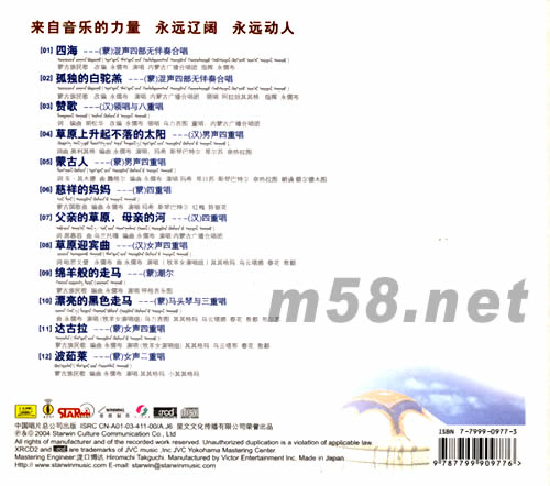 來自音樂的力量 永遠遼闊 永遠動人 1、四海--(蒙)混音聲四部無伴奏合唱歌 2、孤獨的白駝羔---(蒙)混音四部無伴奏合唱 3、贊歌---(漢)領唱與八重唱 4、草原上升起不落的太陽---(漢)男聲四重唱 5、蒙古人---(蒙)男聲四重唱 6、慈祥的媽媽--(蒙)四重唱 7、父親的草原,母親的河---(漢)四重唱 8、草原迎曲---(漢)女聲四重唱 9、綿羊般的走馬---(蒙)潮爾 10、漂亮的黑色走馬---(蒙)馬頭琴與三重唱 11、達古拉---(蒙)女聲四重唱 12、波茹萊---(蒙)女聲二重唱