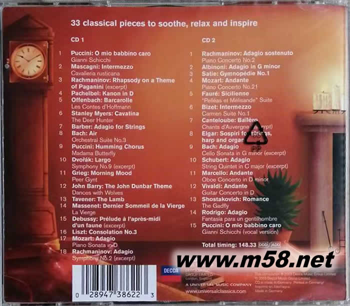 《The Very Best Of Relaxing Classics》古典舒情 CD 精選共收錄 33 首經典作品,又一超值之選。本碟的主題“凈化身心,舒緩生活”,合適工作繁忙的都市人用來減壓。《The Very Best Of Relaxing Classics》選取了柔和,寧靜和篇幅短少的樂段。在碟中第一首《O mic babbino caro》就是Giacomo Puccini的一套歌劇作品《Gianni Schicchi》的選段。有些熟悉的曲目選自于電影插曲,如 Sergei Rachmaninov《Rhapsody on a Theme of Paganini,Op.》由鋼琴和樂隊 (Orchestra) 合奏,為《Somewhere In Time》 (時光倒流七十年) 的電影金曲。以及 John Barry《The John Dunbar Theme》由交響樂團演奏,曾被用作電影《Dance With Wolves》 (與狼共舞) 的配樂。碟中印象較深刻的是 Myers 的《Cavatina》是電影《The Deer Hunter》 (獵鹿人) 的經典名曲。