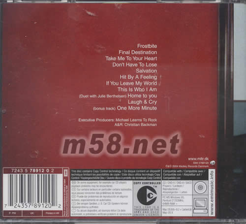 1、FROSTBITE 2、FINAL DESTINATION 3、TAKE ME TO YOUR HEART 4、DON‘T HAVE TO LOSR 5、SALVATION 6、HIT BY A FEELING 7、IF YOU LEAVE MY WORLD 8、THIS IS WHO I AM 9、(DUET WITH JULIEBERTHELSEN)HOME TO YOU 10、LAUGH —CRY 11、(BONUS RTACK )ONE MORE MINUTE