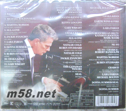 CD: 01. EARTH, WIND & FIRE 球風火合唱團 - In The Stone/September Medley 掀起70年代黑人流行音樂狂瀾的球風火合唱團,勾引耳熟能詳的組曲! 02. KENNY LOGGINS 肯尼羅根斯 - Forever 80年代最佳電影主題曲代言人肯尼羅根斯,獻上最拿手的經典情歌! 03. MICHAEL BOLTON/SEAL 麥可伯特恩/席爾 - When A Man Loves A Woman/It’s A Man’s Man’s Man’s World Medley 2座葛萊美+6座全美音樂獎的抒情歌王麥可伯特恩,與英國首席靈魂大使席爾以組曲方式過癮互飆! 04. MARTINA McBRIDE 瑪汀娜 - We’ve Got Tonight 有著「鄉村界的席琳狄翁」稱號的當代鄉村天后瑪汀娜,重新詮釋巴布席格(Bob Seger)的動人抒情名曲! 05. ALL-4-ONE 合而為一合唱團 - I Can Love You Like That/I Swear Medley 葛萊美「最佳流行演唱團體」合而為一合唱團,以完美無暇的和聲,一口氣獻出2首獲葛萊美獎青睞的經典名曲! 06. JACKIE EVANCHO 潔姬伊凡科 - Pie Jesu 奪下2010年美國熱門選秀節目【America’s Got Talent】亞軍名次,年僅10歲的天籟美聲女童潔姬伊凡科,淋漓盡致地獻出挺進前十強的參賽曲—音樂劇大師安德魯洛伊韋伯所作的安魂曲! 07. LARA FABIAN 蘿拉菲比安 - Caruso 英、法、義、西4語天后蘿拉菲比安,重新詮釋義大利情歌! 08. DONNA SUMMER/SEAL 唐娜桑瑪/席爾 - Unbreak My Heart/Crazy/On The Radio Medley 迪斯可女王唐娜桑瑪與英國首席靈魂大使席爾,攜手再創演唱會的高潮! 09. RUBEN STUDDARD 魯本史坦德 - Home 2003年美國偶像冠軍、「路瑟范德魯斯接班人」魯本史坦德,重新詮釋「新浪漫主義歌手」麥可布雷的名曲! 10. CHAKA KHAN 夏卡康 - Through The Fire 縱橫流行樂壇30余年的靈魂放克歌姬夏卡康,現場完美詮釋其個人事業的巔峰代表作! 11. GARY WRIGHT 蓋瑞萊特 - Dream Weaver 70年代紅極一時的鋼琴歌手蓋瑞萊特,獻出其1976年全美排行亞軍曲! DVD: DAVID FOSTER WITH BRIAN BOITANO AND KRISTI YAMAGUCHI 大衛佛斯特與布萊恩伯伊塔諾/山口克莉絲蒂 – Winter Games 演唱會由1988/1992冬季奧運男子/女子花式溜冰金牌得主--布萊恩伯伊塔諾/山口克莉絲蒂引言開場,則在大衛佛斯特的鋼琴彈奏與管絃樂隊的襯托下,氣勢磅礡、撼動人心! KENNY LOGGINS/KENNY G 肯尼羅根斯/肯尼吉 - Heart To Heart KENNY LOGGINS 肯尼羅根斯 - Forever 80年代最佳電影主題曲代言者肯尼羅根斯,先是與流行音樂史上最暢銷的演奏藝人肯尼吉聯手,接著又以獨唱的方式,一連帶來2首其80年代最膾炙人口的經典抒情名曲! GARY WRIGHT 蓋瑞萊特 - Dream Weaver 70年代紅極一時的鋼琴歌手蓋瑞萊特,獻出其1976年全美排行亞軍曲! CHAKA KHAN 夏卡康 - Through The Fire 縱橫流行樂壇30余年的靈魂放克歌姬夏卡康,現場完美詮釋其個人事業的巔峰代表作! ALL-4-ONE 合而為一合唱團 - I Can Love You Like That/I Swear Medley 葛萊美「最佳流行演唱團體」合而為一合唱團,以完美無暇的和聲,一口氣獻出2首獲葛萊美獎青睞的經典名曲! NATALIE COLE/RUBEN STUDDARD 娜坦莉高/魯本史坦德 - When I Fall In Love 榮獲9座葛萊美獎肯定的跨界女伶娜坦莉高+第二屆美國偶像冠軍得主魯本史坦德,首次同臺深情對唱熟悉的老情歌! NATALIE COLE 娜坦莉高 - This Will Be 娜坦莉高繼續獨自帶來為她奪得首座葛萊美獎「最佳節奏藍調女歌手」大獎的冠軍名曲! JACKIE EVANCHO 潔姬伊凡科 - Pie Jesu/O Mio Bambino Caro Medley 2010年美國熱門選秀節目【America’s Got Talent】亞軍得主,年僅10歲卻有著不可思議天籟美聲的潔姬伊凡科,以毫不怯場的大將之風,淋漓盡致地將其兩首參賽曲唱出滿堂喝采! THE CANADIAN TENORS 加拿大男高音 - Because We Believe 加拿大跨界男聲組合,翻唱跨界男高音安德烈波伽利的名曲,此曲亦是由大衛佛斯特與女兒艾咪以及安德烈波伽利所共同為2006冬季奧運閉幕式所合寫的作品! SEAL 席爾 - Secret 締造全球1500萬張銷售量,抱走葛萊美「最佳流行男演唱人」大獎的英國首席靈魂大使席爾,獻唱由大衛佛斯特所掌舵的2010年最新專輯“Commitment”中的首支熱門單曲! MICHAEL BOLTON/SEAL 麥可伯特恩/席爾 - When A Man Loves A Woman/It’s A Man’s Man’s Man’s World Medley 2座葛萊美獎+6座全美音樂獎的抒情歌王麥可伯特恩,與席爾一起過癮互飆、重現兩人各自的代表作品! CHAKA KHAN 夏卡康 - I'm Every Woman 靈魂放克歌姬夏卡康再度現身帶來她於1978年創下的首支個人冠軍單曲! EARTH, WIND & FIRE 球風火合唱團 - In The Stone/September/After the Love Has Gone Medley 掀起70年代黑人流行音樂狂瀾的球風火合唱團,一連帶來3首70年末的暢銷排行名曲! LARA FABIAN 蘿拉菲比安 - Caruso 英、法、義、西4語天后蘿拉菲比安,重新詮釋義大利情歌! ORSON BEAN/MEGAN HILTY/KATHRYN JOOSTEN/MARK MASRI - Say You Remember it (from “Betty Boop: The Musical”) 大衛佛斯特正著手進行的音樂劇大作【貝蒂布】提前在演唱會中曝光! NE-YO 尼歐 - Miss Independent R&B界暢銷金童尼歐上臺率先帶來其2008年的R&B排行冠軍單曲! NE-YO/CHARICE/ROBERT RANDOLPH 尼歐/夏芮絲/羅伯藍道夫 - Earth Song 尼歐+流行天后接班人夏芮絲+Funky Soul大將羅伯藍道夫,共同向永遠的流行天王麥可杰克森致敬! MARTINA MCBRIDE 瑪汀娜 - Smile/We've Got Tonight Medley 有著「鄉村界的席琳狄翁」稱號的當代鄉村天后瑪汀娜,先是帶來「Smile」,接著重新詮釋巴布席格(Bob Seger) 的動人抒情名曲「We've Got Tonight」! RUBEN STUDDARD 魯本史坦德 - Home 2003年美國偶像冠軍、「路瑟范德魯斯接班人」魯本史坦德,重新詮釋「新浪漫主義歌手」麥可布雷的名曲! CHARICE 夏芮絲 - To Love You More/All By Myse