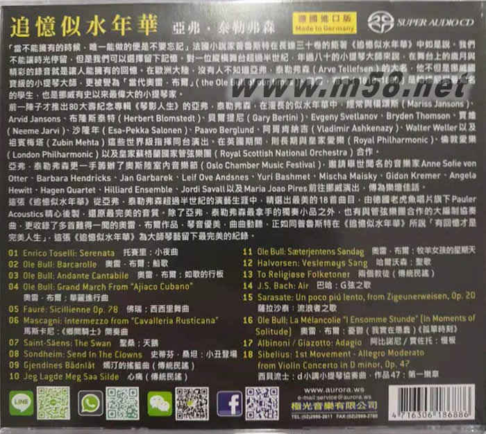 追憶似水年華A La Recherche du Temps Passe SACD 德國發(fā)燒名廠老虎魚(m58.net) 挪威國寶級小提琴大師亞弗.泰勒弗森生涯最美的精選輯老虎魚唱片旗下Pauler Acoustics精心后制展現(xiàn)「鬼斧神工」的錄音技藝! 當(dāng)不能擁有的時候,唯一能做的便是不要忘記」法國小說家普魯斯特在長達(dá)三十卷的巨著《追憶似水年華》中如是說。我們不能讓時光停留,但是我們可以選擇留下記憶。對一位縱橫舞臺超過半世紀(jì),年過八十的小提琴大師來說,在舞臺上的歲月與精彩的錄音就是讓人能擁有的回憶。在歐洲大陸,沒有人不知道亞弗.泰勒弗森(Arve Tellefsen)的大名,他不但是挪威國寶級的小提琴大師,更被譽為「當(dāng)代奧雷.布爾」(the Ole Bull of our times)。奧雷.布爾(1810–1880)是帕格尼尼最知名的學(xué)生,也是挪威有史以來最偉大的小提琴家。 前一陣子才推出80大壽紀(jì)念專輯《琴影人生》的亞弗.泰勒弗森,在漫長的似水年華中,經(jīng)常與楊頌斯(Mariss Jansons)、Arvid Jansons、布隆斯泰特(Herbert Blomstedt)、貝爾提尼(Gary Bertini)、Evgeny Svetlanov、Bryden Thomson、賈維(Neeme Jarvi)、沙隆年(Esa-Pekka Salonen)、Paavo Berglund、阿胥肯納吉(Vladimir Ashkenazy)、Walter Weller以及祖賓梅塔(Zubin Mehta)這些世界級指揮同臺演出。在英國期間,則長期與皇家愛樂(Royal Philharmonic)、倫敦愛樂(London Philharmonic)以及皇家蘇格蘭國家管弦樂團(tuán)(Royal Scottish National Orchestra)合作。 亞弗.泰勒弗森更一手籌辦了奧斯陸室內(nèi)音樂節(jié)(Oslo Chamber Music Festival),邀請舉世聞名的音樂家Anne Sofie von Otter、Barbara Hendricks、Jan Garbarek、Leif Ove Andsnes、Yuri Bashmet、Mischa Maisky、Gidon Kremer、Angela Hewitt、Hagen Quartet、Hilliard Ensemble、Jordi Savall以及Maria Joao Pires前往挪威演出,傳為樂壇佳話。 這張《追憶似水年華》從亞弗.泰勒弗森超過半世紀(jì)的演藝生涯中,精選出最美的18首曲目,由德國老虎魚唱片旗下Pauler Acoustics精心后制,還原最完美的音質(zhì)。除了亞弗.泰勒弗森最拿手的獨奏小品之外,也有與管弦樂團(tuán)合作的大編制協(xié)奏曲,更收錄了多首難得一聞的奧雷.布爾作品,琴音優(yōu)美,曲曲動聽,正如同普魯斯特在《追憶似水年華》所說「有回憶才是完美人生」,這張《追憶似水年華》為大師琴藝留下最完美的紀(jì)錄。