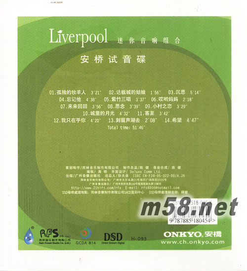 安橋試音碟(m58.net) 音響器材硬件廠都喜歡找一些知名的唱片公司幫忙出自己的試音碟,送給買器材的發(fā)燒友做試音,例如大名鼎鼎的麥景圖試音碟。 安橋是日本著名的音響品牌,她曾經(jīng)請雨林出過一張安橋試音碟,是非賣品。 現(xiàn)在雨林把這張唱片在雨林音樂制作有限公司SACD直刻中心重新進(jìn)行DSD母帶處理后,出版了這款上市銷售的安橋試音碟。 這是一張最好聽的雨林精選。 雨林雖然曾經(jīng)出過精選唱片,但由于要兼顧每一張唱片,也就是俗話說的太公分豬肉,人人有份,所以所選的音樂不一定是以好聽為原則。 而這款安橋試音碟就不一樣了,由安橋來選曲,她就不會人人有份了,挑選的都是雨林里面最好聽的精華。 這款唱片里面都是旋律優(yōu)美、百聽不厭的好歌,絕對是雨林唱片的顛峰代表,里面有陳潔麗、馬小倩、許樂、八只眼、青燕子等等演唱作品