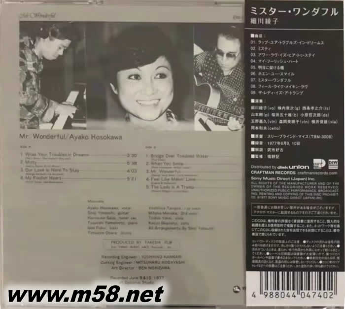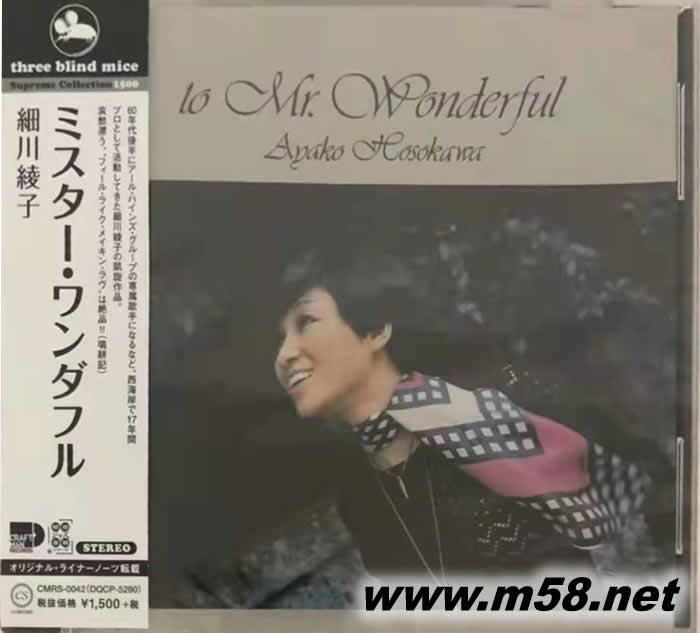 奇妙先生 Mr Wonderful 三盲鼠日本版(m58.net) 這張專輯是亞洲爵士樂金嗓子細川綾子1977年錄制的,采用“三盲鼠”獨特的近距離錄音,聲音無比細膩,后期采用多軌混音制作,擁有驚人的細節與浮凸的定位,是百分百天碟級制作。