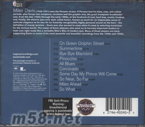 MILES DAVIS (1926-1991)曾是爵士里的畢加索,如果畢加索有過他的單調(diào)、玫瑰、和立體藝術(shù)派的周期,加上雕刻的沖擊,陶藝和繪畫藝術(shù),這個(gè)最偉大的號(hào)手和指揮家,從1940年末至1980年初,一直是最前事衛(wèi)的打擊樂猛手,自由人。最后,這種電子爵士搖滾形式呼喚著溶合。和無瑕的判斷力一樣馳名的剪輯的優(yōu)雅,他是個(gè)為了快認(rèn)識(shí)力、非常個(gè)性的聲音在他在喇叭里——清晰的MOODEY抒情詩——DAVIS 也是個(gè)不二人選,當(dāng)他所在的不同樂隊(duì)需要臺(tái)柱。在給DAVIS伴奏者的花名冊(cè)中誰持續(xù)成為重頭,在他們特 有的概念里,就視誰同真正的現(xiàn)代爵士的代名詞。演奏者們?cè)诖藦垖]嬛兄噩F(xiàn)DAVIS1950年至1960年他的唱 片最勁最美的一些曲目。