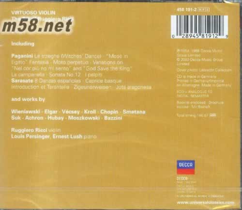 一代小提琴名家里奇黃金十年Virtuoso Violin(m58.net) 黎奇被公認為小提琴超炫派大師,年輕時為DECCA錄製了為數不少的精彩作品,這張專集便保存了其中部份的精華。他以傳承自海飛茲的絕世琴弓,炫耀出所有小提琴可能與不可能的絕技,適當地將每一個用得上的精彩技巧盡情展現。先聽聽專集最后一首巴錫尼的作品《頑皮的輪旋曲》,直令人汗毛直豎,然后再聽聽薩拉沙泰的《流浪者之歌》,以及帕格尼尼的《巫婆之舞》和《鐘》等作品,您不得不承認黎奇確實是技巧派的大師。2000, 12月發行