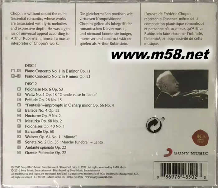 BEST OF CHOPIN 肖邦 鋼琴精選(m58.net) 這套《肖邦精選》雙CD是RCA公司為慶祝作曲家肖邦200歲冥誕,而推出的著名鋼琴演奏家阿圖爾•魯賓斯坦(Arthur Rubinstein)演繹灌錄的肖邦作品系列唱片之一。 在我們的時代中,能像魯賓斯坦強烈地認同肖邦那樣,同某一位作曲家發生緊密聯系的偉大鋼琴家確實極其罕見。當然,阿圖爾•魯賓斯坦的演出曲目是相當龐大的。年輕時,魯賓斯坦擅長演奏當時作曲家的作品。其中有德彪西、拉威爾、希曼諾夫斯基、斯特拉文斯基、普朗克、普羅科菲耶夫,以及西班牙作曲家阿爾貝尼斯、格拉納多斯、法利亞和巴西作曲家維拉洛博斯。其中有不少人還專門為他寫過大量曲子。然而,在魯賓斯坦的早期演出曲目中,占主要地位的還是巴赫、莫扎特、貝多芬和19世紀浪漫派作曲家舒曼、勃拉姆斯、肖邦的作品。魯賓斯坦于1887年生于羅茲,和肖邦是一國同胞。他幼時即為神童,3歲時到柏林為勃拉姆斯的朋友---著名小提琴家約阿希姆演奏。在洛茲和華沙接受了早期教育后,1894年他在故鄉舉行了第一場公開音樂會。從10歲起,魯賓斯坦到柏林,在約阿希姆的督導下繼續學業,師從布魯赫•馬克斯、海因里奇•巴爾特分別學習作曲和鋼琴演奏。 雖然魯賓斯坦在此期間參加過各種音樂會,但是一般把1900年在柏林的演出定為他的正式首演。這場音樂會由約阿希姆指揮,魯賓斯坦獨奏圣桑的《NO. 2鋼琴協奏曲》、莫扎特的《NO. 23鋼琴協奏曲》和舒曼、肖邦的小品。此后,他相繼在德國、波蘭演出,并于1904年巴黎舉行了首場演出。兩年后,他到美國、俄羅斯、奧地利和意大利舉行音樂會,1912年到倫敦首演。第一次世界大戰前期,魯賓斯坦居住在倫敦,1916年到1917年期間,他的絕大部分時間都是在西班牙和南美度過的。 從那時起,魯賓斯坦頻繁地在世界各地演出,卻沒有得到和他的天才相匹配的聲望。他自己了解這種狀況,也知道其中原因。雖然他曾在瑞典同帕德雷夫斯基相處過一段時間,但從巴黎首演開始,就已經拋棄了少年時所受的正規鍵盤演奏法。天賦助他掌握并演奏了大量充滿靈氣和活力的曲目。但是由于他從來沒有在鋼琴大師的指導下長期學習,詮釋出來的作品未免古怪,甚至粗糙,出眾的技巧也不太穩定。1932年,魯賓斯坦終于在巴黎結婚定居,決定安頓下來靜心思考。 他重新研究演奏曲目,對其進行添加和刪減,并建立了新的演奏技巧。這樣的舉動對一位年屆40的藝術家來說著實大膽,況且魯賓斯坦當時已經在音樂愛好者中頗有聲望。經過一段時間以后,重整旗鼓的大志終于有了回報,鑒賞家、批評家和音樂家們越發明顯地感到,他在詮釋和演奏上的神奇能量最終完全釋放了出來。從此,魯賓斯坦踏入20世紀重要鋼琴家的行列。 在肖邦的作品中,我們感受到的是個性化的題材創作、自信的延展以及在隨后作品中愈加豐富的色彩和諧。這些都是為鋼琴而作的交響詩,是鋼琴作品中最熱烈、最具男子氣概的音樂作品。 這套《肖邦精選》唱片中的錄音,可以讓我們領略到魯賓斯坦非凡的鋼琴天賦,他的演奏風格極具感染力。這既表現在抒情溫暖、熱情激昂的波洛奈茲中,又體現在他演奏兩部協奏曲的個人風格中。
