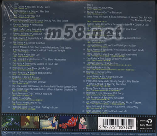DISC 1 1、PHIL COLLINS ——YOU'LL BE IN MY HEART (電影TARZAN 泰山) 2、ROBBIE WILLIAMS ——BEYOND THE SEA (電影:FINDING NEMO海底奇兵) 3、PHIL COLLINS ——NO WAY OUT (電影:BROTHER BEAR 熊之歷險) 4、CELINE DION AND PEABO BRYSON——BEAUTY AND THE BEAST (電影:BEAUTY AND THE BEAST 美女與野獸) 5、CHRISTINA AGUILERA——REFLECTION (電影MULAN花木蘭) 6、STING——MY FUNNY FRIEND AND ME (電影EMPERO‘S NEW GROOVE 騎呢大帝) 7、VANESSA WILLIAMS——COLORS OF THE WIND (電影POCAHONTAS 風中奇緣) 8、PEABO BRYSON®INA BELLE—— A WHOLE NEW WORLD (電影ALADDIN阿拉丁) 9、PHIL COLLINS——STRANGER LIKE ME(電影TARZAN泰山) 10、JOSEPH WILLIAMS &SALLY DWORSKY WITH NATHAN LANE, ERNIE SABELLA,&KRISTIE EDWARDS---CAN YOU FEEL THE LOVE TONIGHT (電影LION KING 獅子王) 11、PETER ANDRE ---KISS THE GIRL (電影LITTLE MERMAID 小魚仙) 12、PHIL HARRIS &BRUCE REITHERMAN_THE BARE NECESSITIES (電影JUNGIE BOOK 小泰山) 13、PHIL HARRIS——EVERYBODY WANTS TO BE A CAT (電影ARISTOCATS 富貴貓) 14、PHIL COLLINS ——LOOK THROUGH MY EYES(電影BROTHER BEAR熊之歷險) 15、LOUIS ARMSTRONG——BIBBIDI BOBBIDI BOO (電影THE CINDERELLA 仙履奇緣) 16、PEGGY LEE——HE’S A APRIL SHOWER (電影LADY AND THE TRAMP小姐與流氓) 17、DISNEY CHOIR ——LITTLE APRIL SHOWER (電影BAMBI小鹿斑比) 18、THE CROW QUINTEL:CLIFF EDWARDS ,JIM CARMICHAEL&THE HALL JOHNSON CHOIR AND THE WALT DISNEY STUDIO ORCHESTRA---WHEN I SEE AN ELEPHANT FLY (電影DUMTO小飛象) 19、RANDY NEWMAN——THE TIME OF YOUR LIFE (電影BUG‘S LIFE 蟲蟲特工隊) 20、ETERNAL——SOMEDAY (電影HUNCHBACK OF NOTRE DAME鐘樓駝俠) 21、TINA TURNER——HE LIVES IN YOU (電影LION KING 2 獅子王2) 22、F4(BONUS TRACK)——CAN’T HELP FALLING IN LOVE (電影LILO AND STITCH 扮野小魔星) DISC 2 1、PHIL COLLINS ——ON MY WAY (電影院TAZAN泰山) 2、MICHAEL BOLTON ——GO THE DISTANCE (電影HERCUIES大力士) 3、LOUIS PRIMA,PHIL HARRIS&BRUCE REITHEMAN_I WANNA BE LIKE YOU (THE MONKEY SONG) (電影JUNGLE BOOK小泰山) 4、CARMEN TWILLIE AFRICAN VOCAL PERFOMED BY LEBO M---CIRCLE OF LIFE (電影獅子王) 5、98 DEGREES AND STEVIE WONDER——TRUE TO YOUR HEART (電影MULAN 花木蘭) 6、SAMUEL E WRIGHT——UNDER THE SEA (電影LITTLE MERMAID小魚仙) 7、NATHAN LANE,ERNIE SABELLA ,JASON WEAVER&JOSEPH WILLIAMS_HAKUNA MATATA (電影獅子王) 8\LOUIS ARMSTRONG_WHEN YOU WISH UPON A STAR (電影木偶奇遇記) 9、YOU‘VE GOT A FRIEND IN ME (反斗奇兵) 10、KENNY LIGGINS——YOUR HEART WILL LEAD YOU HOME(小熊維尼友情歷險記) 11、FESS PARKER THE BALLAD OF DAVY CROCKETT (電影大衛 克羅傳) 12、HEITH ——HO (電影白雪公主與七個小矮人) 13、I’LL TRY (電影飛越夢幻島) 14、BOYZON SHOOTING STAR (電影大力士) 15、ZIP A DEE DOO DAH(南方之歌) 16、PINTO COLVIG MARY MODER DOROTHY COMPTON BILY BLETCHER WHO‘S AFRAID OF THE BIG BAD WOLF(電影三只小豬) 17、MICKEY MOUSE MARCH(米老鼠俱樂部) 18、THE SIAMESE CAT SONG(電影小姐與流氓) 20、THE WONDERFUL THING ABOUT TIGERS (JNJY小熊維尼友情歷險記) 21、LOVE WILL RIND A WAY (電影獅子王2) 22、WHEN SHE LOVED ME(電影反斗奇兵2)