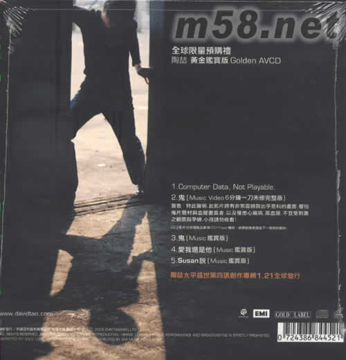 限量預購版附上限量《陶[吉吉]黃金鑒賞版 Golden AVCD》,內容包括: 1、COMPUTER DATA NOT PALYABLE 2、鬼MV(6分鐘一刀未修完整版) 警告:特此聲明,此影片將有非常震撼與出乎意料的畫面,懼怕鬼片題材與血腥畫面者,以及患心臟病、高血壓、不宜受刺激之觀眾與孕婦、小孩請勿收看! 3、鬼 music(鑒賞版) 4、愛我還是他 music(鑒賞版) 5、Susan說 music(鑒賞版) 01. 鬼 (Overture) 02. 鬼 03. Catherine 04. 就是愛你 05. 孫子兵法 06. 愛我還是他 07. Susan 說 08. 無緣 09. Sula 與 Lampa 的寓言 10. 2night 藏愛 11. 愛是個什么東西 12. 她的歌 13. 禱告良辰歌