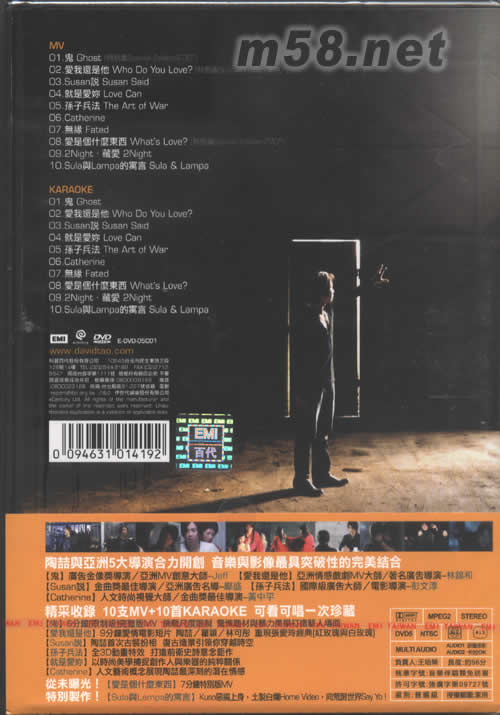 MV 01. 鬼 Ghost[特別版Special Edition] 02. 愛我還是他 Who Do You Love?[特別版Special Edition] 03. Susan說 Susan Said 04. 就是愛你 Love Can 05. 孫子兵法 The Art of War 06. Catherine 07. 無緣 Fated 08. 愛是個什么東西 What's Love?[特別版Special Edition] 09. 2Night.藏愛 2Night 10. Sula與Lampa的寓言 Sula & Lampa KARAOKE 01. 鬼 Ghost 02. 愛我還是他 Who Do You Love? 03. Susan說 Susan Said 04. 就是愛你 Love Can 05. 孫子兵法 The Art of War 06. Catherine 07. 無緣 Fated 08. 愛是個什么東西 What's Love? 09. 2Night.藏愛 2Night 10. Sula與Lampa 的寓言 Sula & Lampa