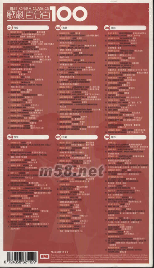 歌劇百分百套裝(m58.net) 6CD超優惠從發售 內佰精彩中文解說 一次收齊所有最知名最優美的歌劇段子, 100首歌劇史上最具代表性的詠嘆調或重唱旋律 EMI唱片 百分百6CD套裝系列有: 1、古典百分百套裝 2、鋼琴百分百套裝 3、歌劇百分百套裝 4、電影百分百套裝 5、莫扎特百分百套裝 6、爵士百分百套裝 在這六片CD中,依照語言和演唱編制的風格,找到一百首歌劇史上最具代表性的詠嘆調或重唱旋律,一次將所有您會在媒體上聽到的知名歌劇旋律全部收齊。并由二十世紀歌劇史上曾經叱咤風云的男女歌唱家擔綱演唱。您可以聽到卡拉絲的名唱「圣潔女神」、柯瑞里的「圣潔阿伊達」、卡芭葉演唱曼儂、卡娜娃演唱柳兒、史柯朵演唱蝴蝶夫人、卡列拉斯演唱「粉墨登場」、舒娃茲柯芙演唱「女人皆如是」、蓋達演唱「維特」、安赫莉絲演唱「卡門」、費雪狄斯考演唱唐懷瑟、多明哥演唱奧泰羅、帕華洛第演唱馬斯康尼。眾星云集,各展歌藝,是歷來收錄最廣、曲目最豐、歌藝最精的一套歌劇精選。