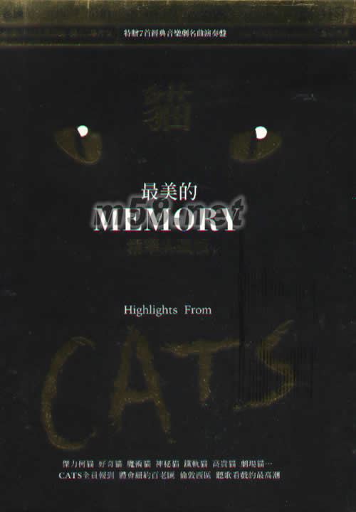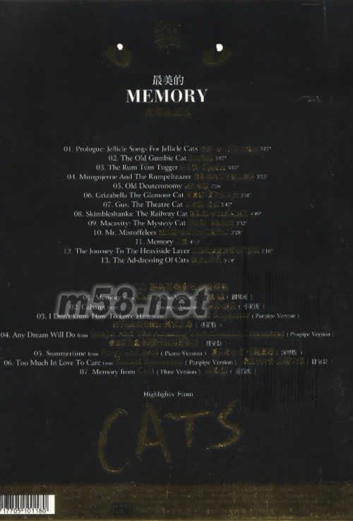 01. Prologue:Jellicle Songs For Jellicle Cats 序幕:杰力柯貓主題曲 02. The Old Gumbie Cat 剛比老貓 03. The Rum Tum Tugger 好奇貓-若騰塔格 04. Mungojerrie And The Rumpelteazer 龐哥杰瑞和若普立提茲 05. Old Deuteronomy 舊約老貓 06. Grizabella The Glamour Cat 高貴貓-葛芮莎貝拉 07. Gus:The Theatre Cat 劇場貓-蓋茲 08. Skimbleshanks:The Railway Cat 鐵軌貓-史金柏斯漢克 09. Macavity:The Mystery Cat 神秘貓-麥凱維提 10. Mr.Mistoffelees 魔術貓-密斯托佛立斯先生 11. Memory 回憶 12. The Journey To The Heaviside Layer 前往哈維賽德雷耶的旅程 13. The Ad-dressing Of Cats 貓族的辨白 Bonus CD 經典音樂劇名曲演奏盤 01. Momory from Cats(Piano Version) 回憶-貓(鋼琴版) 02. Cabaret from Cabaret(Trumpet Version) 酒店-酒店(小號版) 03. I Don't know How To Love Him from Jesus Christ Superstar(Panpipe Version) 我不知如何去愛他-萬世巨星(排笛版) 04. Any Dream Will Do from Joseph And The Amazing Technicolour Dreamcoat(Panpipe Version) 夢想的力量-約瑟夫的神奇彩衣(排笛版) 05. Summertime from Porgy and Bess(Piano Version) 夏日時光-乞丐與蕩婦(鋼琴版) 06. Too Much In Love To Care from Sunset Boulevard(Panpipe Version) 最在乎的愛-日落大道(排笛版) 07. Memory from Cats(Flute Version) 回憶-貓(長笛版)