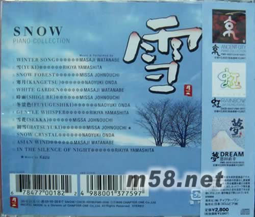 價格為估,以實到貨為準(zhǔn)! 書香系列日本版 雪(m58.net) 雪 SNOW piano collection pacific moon 全新鋼琴專輯,請來四位新世紀鋼琴演奏家,包括:渡邊雅二,山下力哉,恩田直幸及城之內(nèi):合力作出十三首精彩鋼琴作品,充滿濃厚東洋風(fēng)味,動人心靈,令大家沉醉于冬日浪漫之中!