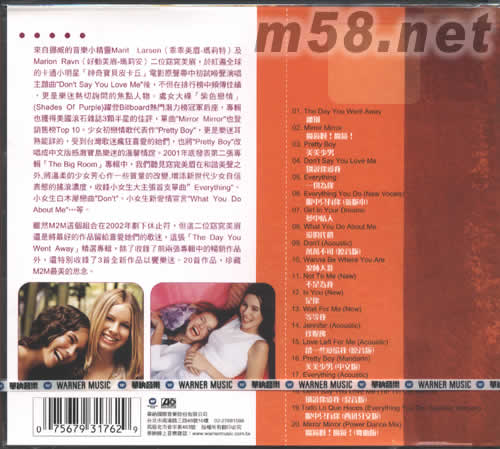 The Day You Went Away:The Best Of M2M 窈窕美眉(m58.net) The Day You Went Away:The Best Of 英美史上最年輕的創(chuàng)作二人組唯一精選作品輯 來自挪威的音樂小精靈Marit Larsen(乖乖美眉-瑪莉特)及Marion Ravn(好動美眉-瑪莉安)二位窈窕美眉,于紅遍全球的卡通小明星[神奇寶貝皮卡丘]電影原聲帶中初試啼聲演唱主題曲"Don't Say You Love Me"后,不但在排行榜中頻傳佳績,更是樂迷熱切詢問的焦點人物。處女大碟[紫色戀情](Shades Of Purple)躍登Billboard熱門潛力榜冠軍后座,專輯也獲是美國滾石雜志3顆半星的佳評,單曲"Mirror Mirror"也登銷售榜Top 10。少女初戀情歌代表作"Pretty Boy",更是樂迷耳熟能詳?shù)模艿脚_灣歌迷瘋狂喜愛的她們,也將"Pretty Boy"改唱成中文版感激寶島樂迷的溫馨情誼。2001年底發(fā)表第二張專輯[The Big Room]專輯中,我們聽見窈窕美眉在和諧美聲之外,將溫柔的少女芳心作一些質(zhì)量的改變,增添新世代少女自信表態(tài)的搖滾濃度,收錄小女生大主張首支單曲"Everything"、小女生白木屋戀曲"Don't"、小女生新愛情宣言"What You Do About Me"…等。 雖然M2M這個組合在2002年劃下休止符,但這二位窈窕美眉還是將最好的作品留給喜愛她們的歌迷,這張[The Day You Went Away]精選專輯,除了收錄了前兩張專輯中的暢銷作品外,還特別收錄了3首全新作品以饗樂迷。20首作品,珍藏M2M最美的思念。