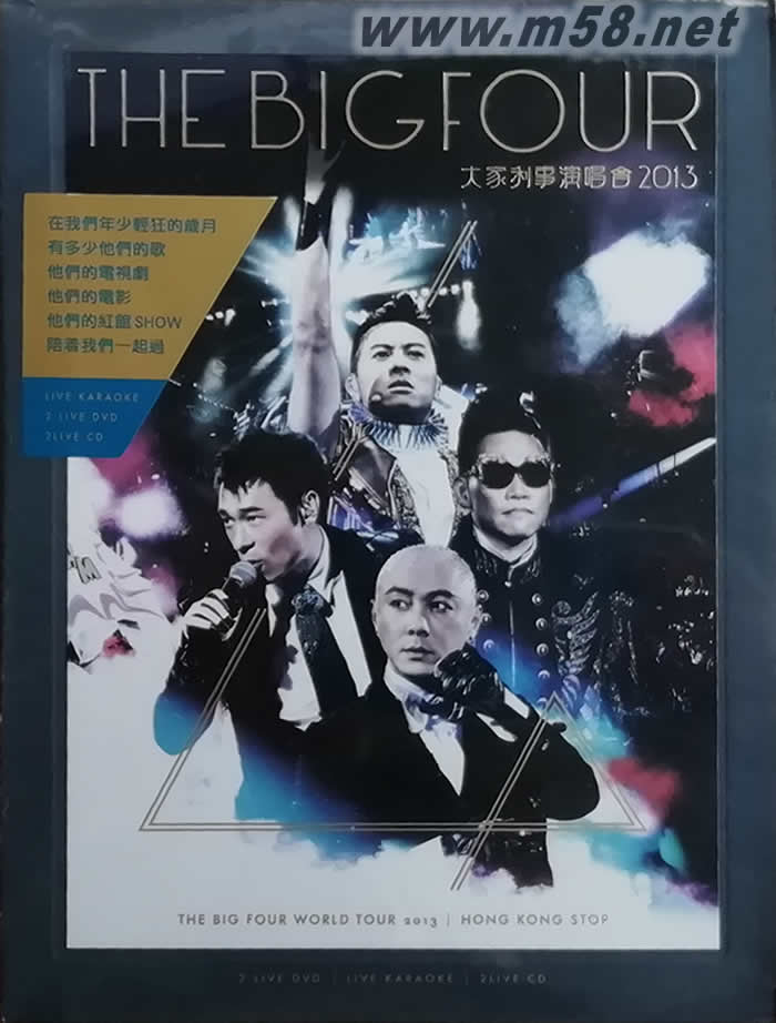 THE BIG FOUR 大家利事演唱會2013 (2 Live DVD + Karaoke DVD + 2 Live CD)(m58.net) Big Four歲晚徐夕夜將于紅館開騷,舉行《The Big Four大家利事世界巡迴演唱會2013》,張衞健、許志安、蘇永康和梁漢文與樂迷共度新春至年初五,特別為演唱會獻唱賀年新曲「大家利事」和medley!四子載歌載舞之馀,又在臺上不斷互嘲和惡搞,將最怕再見到的昔日造型重現(xiàn)舞臺(蘇永康扮演張衞健當年的孫悟空造型,梁漢文將當年康仔的臺灣夜店事件,張衛(wèi)健扮安仔當年全裸拍寫真集的造型),笑翻全場!Big Four施展渾身解數(shù)演出,吊威飛飛翔又大演踢板,許志安更在以飛天鋼琴自彈自唱,梁漢文跳勁舞,張衛(wèi)健棟篤笑兼變魔術(shù)。 《大家利事演唱會2013》首批以Live雙DVD+Bonus Live雙CD+卡拉OK DVD發(fā)行。