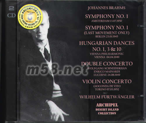 JOHANNES BRAHMS SYMPHONY NO.1 OP.68 CONCERTGEBOUW ORCHESTRA AMSTERDAM SYMPHONY NO.1(LAST MOVEMENT) BERLIN PHILHARMONIC BERLIN (ONLY SURVIVING RECORDING FROM THIS CONCERT) HUNGARIAN DANCES NO.1,3&10 VIENNA PHILHARMONIC VIENNA DOUBLE CONCERTO OP.102 WOLFGANG SCHNEIDERHAN,VIOLIN;ENRICO MAINARDI,VIOLONCELLO LUCERNE FESTIVAL ORCHESTRA LUCERNE VIOLIN CONCERTO OP.77 GIOCONDA DE VITO ,VIOLIN RAI ROCHESTRA TORINO WILHELM FURTWANGLER