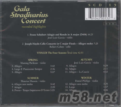 1、FRANZ SCHUBERT ADAGIO AND RONDO IN A MAJOR(D438) /JOSE-LUIS GARCIA VIOLIN 2、JOSEPH HAYDN CELLO CONCERTO IN C JAJOR FINALE-ALLEGRO MLOTO /ROBERT COHEN CELLO VIVALDI THE FOUR SEASONS TOTAL TIME:42:51 SPRING MANOUG PARIKIAN VIOLIN 3、ALLEGRO 4、LARGO E PIANISSIMO SEMPRE 5、ALLEGRO SUMMER MAURICE HASSON VIOLIN 6、ALEGRO NON MOLTO 7、ADAGIO 8、PRESTO TIMPO IMPETUOSO D‘ESTATE AUTUMN JOSE-LUIS GARCIA VIOLIN 9、ALLEGRO 10、ADAGIO 11、ALLEGRO LA CACCIA WINTER DANIEL PHILLIPS VIOLIN 12、ALLEGRO NON MOLTO 13、LARGO 14、ALLEGRO