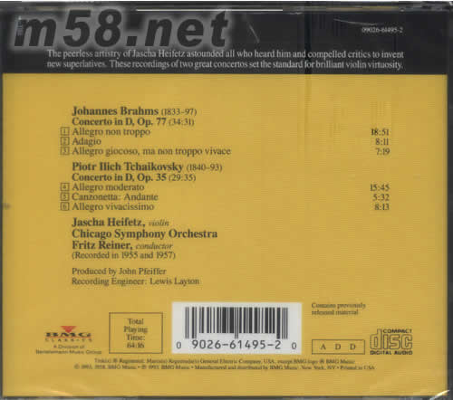 BRAHMS TCHAIKOVSKY博拉姆斯 柴科夫斯基小提琴協(xié)奏曲海飛茲(LIVING STEREO 逼真立體聲系列)(m58.net)