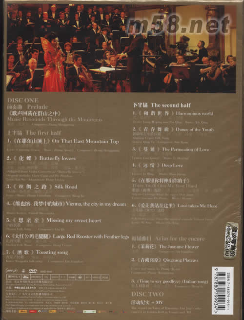 DISC ONE 前奏曲:《歌聲回蕩在群山之中》 上半場: 1、《 在 那 東 山 頂 上 》 詞:倉央嘉措 曲:張千一 編曲:張宏光 《在那東山頂上》是譚晶的成名曲。歌曲源自祖國西藏六世達賴倉央嘉措的愛情詩,描述了一對戀人從相見到相知、從相戀到相思的美好情感。 少年心境,眷眷情深。拉薩的八廓街矗立著一座黃房子,據說是微服出行的倉央嘉措與情人幽會之處。這座房子現已改作一家酒吧,叫做瑪吉阿米(直譯為“未嫁少女”)。人們徜徉在咖啡廳屋頂上,欣賞著不遠處巍峨神圣的布達拉宮,突然傳來譚晶演繹的這首歌,令人油然而生“此曲只應天上有”的感嘆。 2、《 化 蝶 》 根據小提琴協奏曲《梁祝》改編 原曲:陳鋼何占豪詞:閻肅改編:董樂弦 愛情故事《梁山伯與祝英臺》,在中國家喻戶曉。蘊含著江南韻味的《化蝶》,以民間戲曲唱腔為素材,深入而細膩地描繪了男女主人公梁山伯與祝英臺,從相愛、抗婚、相會到化成蝴蝶的熾熱情感和深邃意境。 浪漫而堅貞的愛情,幻化成倆只斑斕的蝶,雄雌相伴,翩然起舞,在春光中重溫那段美好的愛情。 世間愛情無南北,中西文化的交流同樣也有著內蘊深刻的和諧基因。歌者譚晶端坐在奧地利美麗的月亮湖邊,湖光倒映著山色,蝴蝶嬉戲于湖面,不由聯想起發生在這里的茜茜公主的愛情故事,與中國的愛情佳話梁祝如出一轍,有異曲同工之妙,大美無聲之境,感慨良多。 3、《 絲 綢 之 路 》 詞/曲:張連春編曲:孟可 一條雋永的綢緞,綿延萬里,飄舞千年。絲綢之路從中國古長安(今西安)伸向西域,始于周秦,盛于漢唐,是東西方最早的物質、文化交流通道。此刻,連接歐亞大陸的絲綢之路在譚晶的歌唱中延伸到維也納金色大廳的舞臺。 《絲綢之路》運用新疆民歌素材編曲,極富西域風情,以徐緩而沉韌、委婉而奔放的旋律詮釋了“悠悠駝鈴”與“大漠孤煙”的古典意境。 人們仿佛看到,無邊無際的金色沙漠里,五彩斑斕的絲綢在陽光下熠熠閃光,悅耳的駝鈴聲漸行漸遠,踏著歌的行板,在沙漠瀚海中跋涉的駝隊由線漸漸變為一個點,消失在茫茫天際。對大自然的敬畏,對中華燦爛文化的感念,也凝固在無盡的掛念與祈盼中。 4、《維也納,我夢中的城市》 曲/詞:魯道夫·希津斯基 穿行在維也納,仿佛流連于鋼琴的鍵盤。每一處樓閣雕塑都如樂譜般流暢,每一處街景都似夢若幻。 眾多以維也納為題材的歌曲中,這首最為著名,它的詞曲作者魯道夫·希津斯基,祖先來自波蘭,但他本人已是“生于斯,長于斯,死于斯”的地道的維也納人。 刻意穿上奧地利服裝的譚晶,以她完美的歌聲,贏得了現場觀眾的尊敬和喜愛。歌者與聽者的息息相通,使和諧氣氛氤氳在金色大廳。譚晶《和諧之聲-譚晶維也納金色大廳獨唱音樂會》 5、《 想 親 親 》 山西民歌編曲:劉琦 譚晶的家鄉山西,盛產陳醋與紅棗,也盛產民歌。民歌既是民族的也是世界的。民歌既有傳統美也有時尚美。譚晶深得個中味,深解個中情。 奧地利歌唱家托馬斯·提斯勒與譚晶對唱的《想親親》,詼諧活潑,妙趣橫生,令人于中西合璧的演唱中領略中華鄉土風情。 山西民歌中有許多糧食般樸素的情歌,直抵人心。靜謐的歲月里,黃土高坡上的男人和女子,思念、傾訴、密約、私奔,把那些歌連起來就是一場蕩氣回腸的歌劇。 6、《大紅公雞毛腿腿》 山西民歌編曲:董樂弦 這是一首具有濃郁鄉土氣息的民間情歌,幽默俏皮,情真意切,看似平常實則演唱難度極高,需要有很強的吐字行腔工夫。 城市是鄉村的養子,它佩著黃金的首飾,但柏油澆鑄的血管里,流淌的仍是一種叫泥土的東西。對鄉土中國的懷戀,對那片土地上產生的愛情,自然感同身受。 歌者譚晶準確細膩地把握住了一位鄉間小姑娘頑皮活潑、勇敢示愛的微妙心態。在觀眾的心目中,她的表情,她的神態,仿佛鄰家阿嬌,溫婉而親切。 7、《 酒 歌 》 內蒙古民歌編曲:劉鋼寶 粗獷豪放的蒙古人迎接客人時獻上的敬酒歌,歌詞樸實無華、簡潔明快,曲調優美舒暢、鏗鏘有力,完美地體現了廣袤草原的風情與牧民豪爽的性格。 酒的醇香,歌的深情,金色大廳里金色的時光,當一個民族和另外許多個民族相遇,文化的交流與碰撞,濺起愛的火花、情的波浪,令人頓生歌逢知己千首少、酒不醉人心自醉的慨嘆。 下半場: 1、《 和 諧 世 界 》 詞:梁和平印青曲:印青 福至心靈。跟隨音樂漫步在和煦春風與溫暖陽光中,大自然美好的畫卷在你我面前鋪開。 這首歌是整場音樂會的主題曲,也是點睛之作。和諧是音樂世界中最高的追求,也是世俗世界中至善的向往。你和我,你們和我們,共同構成了一個世界,怎能不善待彼此,善待生活。 讓我們和諧之聲中,一起為世界祈福;為愛與被愛的人們祈福;為一切善良與美好的愿望祈福。 2、《 青 春 舞 曲 》 新疆維吾爾族民歌 詞:慶余改編:司徒容 節奏輕快,跳躍,充滿活力,具有維吾爾族民間舞蹈和模擬手鼓演奏的風格,曲調上下流動,偶有跳躍,歡快,流暢。 世間有些東西可以去而復返,有些東西卻一去不返。千呼萬喚,始終不回。比如年紀,比如青春。青春正像那迷失的鳥兒一樣,有去無回。譚晶的演唱,給該曲增添了要認識青春、珍惜青春、把握青春、讓青春與愛同在、讓愛與生命共存的嶄新意韻,使該曲凸現出新的生機與活力。青春的人,青春的心,青春的鳥兒翔舞著青春的精神。歡聲笑語中,青春的鳥兒抖動青春的翅膀,穿