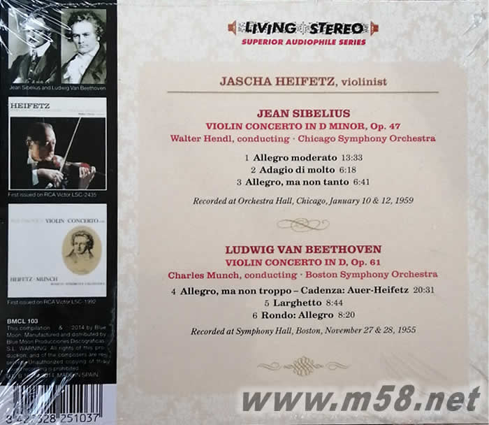 SIBELIUS: VIOLIN CONCERTO IN D MINOR, Op. 47 Walter Hendl, Chicago Symphony Orchestra Recorded at Orchestra Hall, Chicago, January 10 & 12, 1959 01. First Movement - Allegro moderato 02. Second Movement - Adagio di molto 03. Third Movement - Allegro, ma non tanto BEETHOVEN: VIOLIN CONCERTO IN D, Op. 61 Charles Munch, Boston Symphony Orchestra Recorded at Symphony Hall, Boston, November 27 & 28, 1955 04. Allegro, ma non troppo – Cadenza: Auer-Heifetz 05. Larghetto 06. Rondo: Allegro