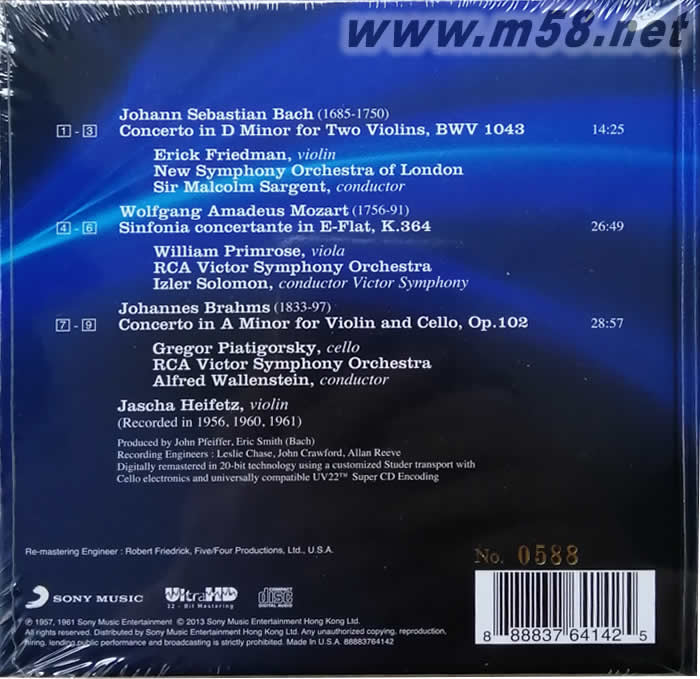 DOUBLE CONCERTOS ULTRAHD 限量版(m58.net) Sony Music Hong Kong與FIM (First Impression Music) 合作之經(jīng)典名盤. 全部母帶Re-mastering及壓碟過程均在美國處理, 每款CD附有詳盡Precision Replication Report 測試報告, 製作嚴(yán)謹(jǐn), 高質(zhì)原音表現(xiàn)! 每款首批1,000張, 特別印有獨(dú)立編號更顯珍貴! 海飛茲是個不折不扣的傳奇人物,他的影響力至今仍深深影響著全世界學(xué)小提琴的人。他是當(dāng)今小提琴家中,為人們留下最多錄音的一位,其出神入化的琴技在這份錄音中充份體現(xiàn),特別是他在RCA唱片公司錄製發(fā)行的唱片被稱為權(quán)威演繹極致,至今仍雄踞各榜首且為樂迷津津樂道。美國小提琴教父艾薩克.史坦(Issac Stern)說:「海飛茲是二十世紀(jì)小提琴界中最強(qiáng)力而深遠(yuǎn)影響」。這份Ultra HD 32-bit 錄音更加細(xì)膩展現(xiàn)海飛茲的完美演出。 巴赫的「D小調(diào)雙小提琴協(xié)奏曲」、莫札特的「降E大調(diào)協(xié)奏交響曲」、布拉姆斯的「小提琴與中提琴的雙重協(xié)奏曲集」是古典音樂史上zui膾炙人口的三大經(jīng)典協(xié)奏曲」,由海飛茲(Jascha Heifetz,1900-1987)擔(dān)綱演奏, 收在同一張專輯里,實在是發(fā)燒友及樂迷之耳福。雙提琴協(xié)奏曲由Platlgorsky(大提琴)、Primrose(中提琴)、Friedman(小提琴)三位提琴家和海菲茲共同演繹。 海菲茲演繹布拉姆斯深刻動聽;莫扎特清新自然,靈感十足;巴赫雍容古樸,不愧為一代宗師。 海飛茲是個不折不扣的天才兒童,自帕格尼尼后,演奏小提琴有著極重要影響力的巨匠。他的演奏曲式霸氣而恢弘、技巧高超精確而完美、從不拉錯一個音。 權(quán)wei樂評人Herbert F Peyser 說:「克萊斯勒是國王,海飛茲則是先知。