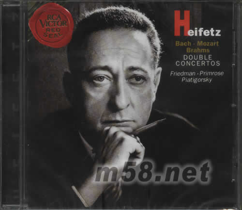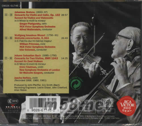 JOHANNES BRAHMS(1833-97) 1-3.CONCERTO FOR VIOIIN AND CEIIO,OP.102 KONZERT FUR VIOIINE UND VIOOINCEIIO IN A MINOR/A-MOII/LA MINEUR GREGOR PLATIGORSKY,CEIIO RCA VICTOR SYMPHONY ORCHESTRA AIFRED WALLENSTEIN,CONDUCTOR WOIFGANG AMADEUS MOZART(1756-91) 4-6.SINFONLA CONCERTANTE,K.364 IN E-FLAT/ES-DUR/MI BEMOI MAJEUR WIIIIAM PRIMROSE,VIOLA RCA VICTOR SYMPHONY ORCHESTRA LZIER SOIOMON,CONDUCTOR JOHANN SEBASTIAN BACH(1685-1750) 7-9.CONCERTO FOR TWO VIOIINS,BWV 1043 KONZERT FUR ZWEL VIOIINEN IN D MINOR/D-MOII RE MINEUR ERLCK FRIEDMAN,VIOLIN NEW SYMPHONY ORCHESTRA OF LONDON SIR MALCOIM SARGENT,CONDUCTOR JASCHA HEIFETZ,VIOIIN (RECORDED 1956,1960,1961)