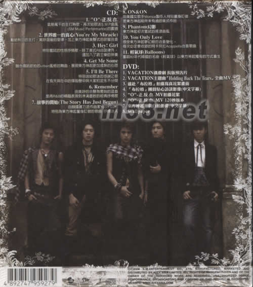 01. "O"-正.反.合. 氣勢萬千的主打熱歌,再次給歌迷S.M.P曲風(SM MUSIC PERFORMANCE)的震撼. 02. 世界唯一的真心 You're my miracle 獻給秋日的主打,美妙溫暖的旋律,加上東方神起的甜蜜合音. 03. Hey! Girl 特別嘗試的性感抒情歌,除了美式R&B旋律外,還加入了爵士樂的伴奏. 04. Get me some 融合HIP HOP 節(jié)拍的URBAN風格的舞曲,民現(xiàn)東方神起更加成熟的心思. 05. I'll be there 特別送給歌迷的感謝之歌,在有天與在中的彈指聲中與大家指約定永不分開 06. Remember 由美妙的合直抒己見為開始的這首,是獎R&B的精髓表現(xiàn)到淋離盡致的經(jīng)典抒情歌. 07.故事的開始 The story has just begun 由韓國實力派作曲家YOON SANG特別為東方神起度身訂做的歌曲,抒情迷人. 08. ON & ON 由美國女歌手MONICA制作人特別度身訂做,是東方神起前所未有過的美式作品 09. Phantom 幻影 東方神起初次嘗試的搖滾曲風 10. You only love 感受東方神起夢幻般的合音變化,每次必定會收錄的 A CAPPELLA合音歌曲 11. 輕氣球 Balloons 重唱80年代韓國的名曲(輕氣球),以東方神起獨有的方式重生. DVD: 1.VACATION偶像劇 長牌預告片 2.VACATION主題曲[HOLDING BACK THE TEARS]全曲MV 3.遠赴[布拉格]拍攝寫真花絮畫面 4.[布拉格]團員貼心訪談影像(中文字幕) 5."O"-正.反.合.MV拍攝花絮 6."O"-正.反.合.MV 120秒版本 7.東方神起團員自拍影像(中文字幕) 8.WALLPAPER