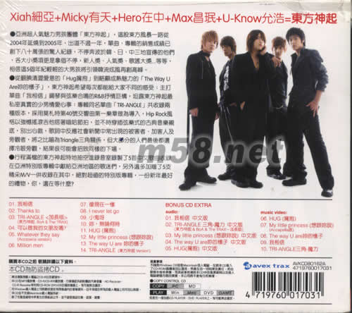 01. 我相信 02. Thanks to 03. TRI-ANGLE[加長版](東方神起.BoA & The TRAX) 04. 可以做我的女朋友嗎? 05. Whatever they say (Accapella version) 06. Million men 07. 像現(xiàn)在一樣 08. I never let go 09. 小鬼呀 10. 你,無論何時(shí) 11. HUG(擁抱) 12. My little princess (想跟你說) 13. The way U are 你的樣子 14. TRI-ANGLE (東方神起 Version) BONUS CD EXTRA audio: 01. 我相信 -中文版 02. TRI-ANGLE 三角-魔力 -中文版 (東方神起 & BoA & The TRAX-加長版) 03. My little princess (想跟你說) -中文版 04. The way U are 你的樣子 -中文版 05. HUG(擁抱) -中文版 music video: 06. HUG(擁抱) 07. My little princess (想跟你說) (Accapella版) 08. The way U are 你的樣子 09. 我相信 10. TRI-ANGLE 三角-魔力