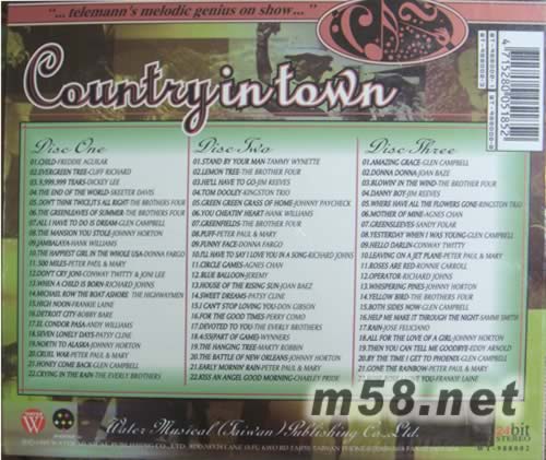Disc one 1. CHILD - FREDDIE AGUILAR 2. EVERGREEN TREE - CLIFF RICHARD 3. 9,999,999 TEARS- DICKEY LEE 4. THE END OF THE WORLD - SKEETER DAVIS 5. DON'T THINK TWICE, IT'S ALL RIGHT - THE BROTHERS FOUR 6. THE GREENLEAVES OF SUMMER - THE BROTHER FOUR 7. ALL I HAVE TO DO IS DREAM - GLEN CAMPBELL 8. THE MANSION YOU STOLE - JOHNNY HORTON 9. JAMBALAYA - HANK WILLIAMS 10. THE HAPPIEST GIRL IN THE WHOLE USA - DONNA FARGO 11. 500 MILES - PETER PAUL & MARY 12. DON'T CRY JONI - CONWAY TWITTY & JONI LEE 13. WHEN IS CHILD IS BORN - RICHARD JOHNS 14. MICHAEL ROW THE BOAT ASHORE - THE HIGHWAYMEN 15. HIGH NOON - FRANKIE LAINE 16. DETROIT CITY - BOBBY BARE 17. EL CONDOR PASA - ANDY WILLIAMS 18. SEVEN LONELY DAYS - PATSY CLINE 19. NORTH TO ALASKA - JOHNNY HORTON 20. CRUEL WAR - PETER PAUL & MARY 21. HONEY COME BACK - GLEN CAMPBELL 22. CRYING IN THE RAIN - THE EVERLY BROTHERS Disc two 1. STAND BY YOUR MAN - TAMMY WYNETTE 2. LEMON TREE - THE BROTHER FOUR 3. HE'LL HAVE TO GO -JIM REEVES 4. TOM DOOLEY - KINGSTON TRIO 5. GREEN GREEN GRASS OF HOME - JOHNNY PAYCHECK 6. YOU CHEATIN' HEART - HANK WILLIAMS 7. GREENFIELD - THE BROTHER FOUR 8. PUFF - PETER PAUL & MARY 9. FUNNY FACE - DONNA FARGO 10. I'LL HAVE TO SAY I LOVE YOU IN A SONG - RICHARD JOHNS 11. CIRCLE GAMES - AGNES CHAN 12. BLUE BALLOON - JEREMY 13. HOUSE OF THE RISING SUN - JOAN BAEZ 14. SWEET DREAMS - PATSY CLINE 15. I CAN'T STOP LOVING YOU - DON GIBSON 16. FOR THE GOOD TIMES - PERRY COMO 17. DEVOTED TO YOU - THE EVERLY BROTHERS 18. 4:55 (PART OF GAME) - WYNNERS 19. THE HANGING TREE - MARTY ROBBIN 20. THE BATTLE OF NEW ORLEANS - JOHNNY HORTON 21. EARLY MORNIN' RAIN - PETER PAUL & MARY 22. KISS AN ANGEL GOOD MORNING - CHARLEY PRIDE Disc three 1. AMAZING GRACE - GLEN CAMPBELL 2. DONNA DONNA - JOAN BAZE 3. BLOWIN' IN THE WIND - THE BROTHER FOUR 4. DANNY BOY - JIM REEVES 5. WHERE HAVE ALL THE FLOWERS GONE - RINGSTON TRIO 6. MOTHER OF MINE - AGNES CHAN 7. GREENSLEEVES - SANDY FOLAR 8. YESTERDAY WHEN I WAS YOUNG - GLEN CAMPBELL 9. HELLO DARLIN - CONWAY TWITTY 10. LEAVING ON A JET PLANE - PETER PAUL & MARY 11. ROSES ARE RED - RONNIE CARROLL 12. OPERATOR - RICHARD JOHNS 13. WHISPERING PINES - JOHNNY HORTON 14. YELLOW BIRD - THE BROTHERS FOUR 15. BOTH SIDES NOW - GLEN CAMPBELL 16. HELP ME MAKE IT THROUGH THE NIGHT - SAMMI SMITH 17. RAIN - JOSE FELICIANO 18. ALL FOR THE LOVE OF A GIRL - JOHNNY HORTON 19. THEN YOU CAN TELL ME GOODBYE - EDDY ARNOLD 20. BY THE TIME I GET TO PHOENIX - GLEN CAMPBELL 21. GONE THE RAINBOW - PETER PAUL & MARY 22. ROSE ROSE I LOVE YOU - FRANKIE LAINE