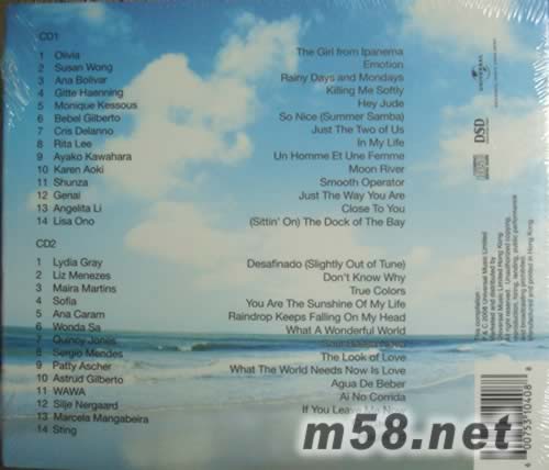 CD 1 1. Olivia – The Girl form Ipanema 2. Susan Wong – Emotion 3. Ana Bolivar – Rainy Days and Mondays 4. Gitte Haenning – Killing Me Softly 5. Monique Kessous – Hey Jude 6. Bebel Gilberto – So Nice (Summer Samba) 7. Cris Delanno – Just The Two of Us 8. Rita Lee – In My Life 9. Ayako Kawahara – Un Homme Et Une Femme 10. Karen Aoki – Moon River 11. Shunza – Smooth Operator 12. Genai – Just The Way You Are 13. Angelita Li – Close To You 14. Lisa Ono – (Sittin On) The Dock of The Bay CD 2 1. Lydia Gray – Desafinado (Slightly Out of Tune) 2. Liz Menezes – Don’t Know Why 3. Maira Martins – True Colors 4. Sofia – You Are The Sunshine Of My Life 5. Ana Caram – Raindrop Keeps Falling on My Head / Rio 6. Wonda Sa – What A Wonderful World 7. Quincy Jones – Soul Bossa Nova 8. Sergio Mendes – The Look of Love 9. Patty Ascher – What The World Needs Now Is Love 10. Astrud Gillberto – Agua De Beber 11. WAWA – Ai No Corrida 12. Silje Nergaard – If You Leave Me Now 13. Marcela Mangabeira – Corcavado (Quiet nights of quiet stars) 14. Sting – Fragilidad