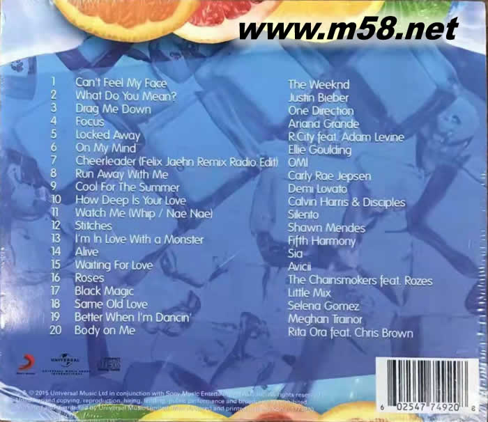 超即時 冠軍排行 SO FRESH 2016 群星合輯(m58.net) 2015年精采樂壇完美劃下句點(diǎn),2016年會流行什么? 神曲在哪里? 【超即時 冠軍排行2016 / SO FRESH 2016】帶你跟上節(jié)奏!從葛萊美獎入圍大贏家,音樂魔人威肯、成功回歸樂壇的小賈斯汀、寫下男孩團(tuán)體新紀(jì)錄1世代、電音精靈艾麗高登、排行榜安娜公主亞莉安娜,再到樂壇新勢力,17歲微笑男孩尚恩曼德斯、雷鬼新狂潮O(jiān)MI、19歲加拿大靈魂歌姬艾莉希等,【超即時 冠軍排行2016】堪稱開春最強(qiáng)大精選,20首洗腦神曲一網(wǎng)打盡! 【曲目】:1. The Weeknd- Can’t Feel My Face 威肯 / 告示牌熱門榜冠軍 樂壇盛讚「下一個麥可杰克森」, 2016葛萊美獎入圍大贏家 2. Justin Bieber - What Do You Mean? 小賈斯汀 / 全球99國iTunes冠軍 成功回歸樂壇,淪陷舞池派對,全美雙白金認(rèn)證 3. One Direction - Drag Me Down 1世代 / 英國金榜冠軍 英倫最強(qiáng)男孩天團(tuán),打破Spotify線上串流紀(jì)錄「一天內(nèi)最多人點(diǎn)播單曲」4. Ariana Grande – Focus * 亞莉安娜 / 英美TOP10 排行榜安娜公主,神曲製造機(jī)Max Martin量身打造 5. OMI – Cheerleader OMI / 全球55國iTunes冠軍 雷鬼新狂潮,「2015夏日國歌」,Spotify線上串流突破3億點(diǎn)播 6. R. City & Adam Levine - Locked Away R. City X 魔力紅亞當(dāng) / 全美電臺點(diǎn)播榜冠軍 嘻哈新樂種混搭魔力紅之亞當(dāng),著魔旋律衝破7400萬次全球串流 7. Selena Gomez - Same Old Love 席琳娜 /全美流行電臺點(diǎn)播榜冠軍 新世代女神大唱愛情宣言,與酷娃恰莉聯(lián)手譜寫 8. Ellie Goulding - On My Mind 艾麗高登 / 全美白金認(rèn)證 入圍2016葛萊美獎,電音精靈再一首洗腦單曲 9. Carly Rae Jepsen - Run Away With Me 卡莉蕾 有請?zhí)├战z指定製作人譜曲,滾石雜誌冊封「2015年50大金曲」10. Sia – Alive * 希雅 / 澳洲金唱片認(rèn)證 不露臉天后全新單曲,力邀流行天后愛黛兒共同創(chuàng)作 11. Demi Lovato - Cool For The Summer 黛咪洛瓦特 / 全美白金認(rèn)證 迪士尼女孩蛻變性感女神,MTV音樂錄影帶大獎「夏日國歌」 12. Shawn Mendes – Stitches 尚恩曼德斯 / 全美三白金認(rèn)證 17歲陽光男孩,首支打入告示牌熱門榜TOP10創(chuàng)作抒情曲 13. Avicii - Waiting For Love 艾維奇 / 瑞典單曲榜冠軍 瑞典電音奇才與百大DJ 季軍Martin Garrix攜手主宰舞池 14 . Calvin Harris & Disciples - How Deep Is Your Love* 凱文哈里斯 / 全英白金認(rèn)證 電音金童再寫新紀(jì)錄,第19首攻入英國金榜TOP10 15. Meghan Trainor - Better When I'm Dancin' 梅根崔娜 / 電影【史努比】主題曲 葛萊美新人棉花糖女孩,與史努比專屬俏皮舞曲16. Pentatonix - Can't Sleep Love 五聲音階 地表最強(qiáng)人聲天團(tuán),用完美音準(zhǔn)打造原創(chuàng)新曲 17. Silento - Watch Me 塞倫托 / 全美金唱片認(rèn)證 奶奶舞掀全民模仿風(fēng)潮,麥特戴蒙、小賈斯汀、NBA「咖哩小子」柯瑞也淪陷 18. Alessia Cara – Here* 艾莉希 / 告示牌節(jié)奏點(diǎn)播榜冠軍 2016樂壇新勢力,19歲加拿大新人一鳴驚人首支單曲 19. The Chainsmokers (feat. ROZES) – Roses* The Chainsmokers 告示牌舞曲榜季軍 新銳紐約電子雙人組,再造EDM國歌 20. Rita Ora (feat. Chris Brown) - Body on Me* 芮塔歐拉 X 克里斯小子 英倫排行天后與R&B小子首度激情對唱 *實(shí)體專輯搶先收錄