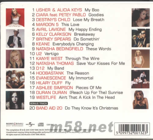 Usher feat Alicia Keys / My Boo 亞瑟小子&艾莉西亞凱斯 榮獲47屆葛萊美獎(jiǎng)最佳R&B/靈魂合唱單曲 Ciara feat Petey Pablo / Goodies 席亞拉 席卷全美流行單曲榜七周冠軍、節(jié)奏藍(lán)調(diào)/嘻哈單曲榜冠軍、2004年度十大單曲No. 9! Destiny’s Child / Lose My Breath 天命真女 闊別三年首次重新聚首完成的全新鉅作,全美排行榜Top3的首支單曲 Maroon 5 / This Love 魔力紅合唱團(tuán) 47屆葛萊美獎(jiǎng)「最佳新進(jìn)藝人」得主,轟動(dòng)英美兩地電臺(tái)點(diǎn)播冠軍曲 Avril Lavigne / My Happy Ending 艾薇兒 空降臺(tái)灣風(fēng)云榜綜合榜冠軍訪臺(tái)冠軍第2支單曲,年度HITO西洋歌曲總冠軍 Kelly Clarkson / Breakaway 凱莉克萊森 「新世代頭號(hào)女歌手」電影【麻雀變公主2:皇家有約】冠軍主題曲 Britney Spears / Do Something 布蘭妮 21世紀(jì)最暢銷女歌手,47屆葛萊美獎(jiǎng)以Toxic奪下「最佳舞曲錄音」后最新單曲 Keane / Everybody’s Changing 基音樂(lè)團(tuán) 全英冠軍大碟銷售大破百萬(wàn)電臺(tái)秋季熱播單曲,找回聽(tīng)音樂(lè)的原始感動(dòng) Natasha Bedingfield / These Words 貝汀菲兒 英國(guó)歌壇冠軍新天后,震撼歌壇全創(chuàng)作冠軍專輯,空降英國(guó)榜冠軍第二支單曲 U2 / Vertigo U2合唱團(tuán) 47屆葛萊美獎(jiǎng)「最佳搖滾雙人或團(tuán)體演唱」、「最佳搖滾歌曲」得獎(jiǎng)作 Kanye West / Through The Wire 凱恩魏斯特 47屆葛萊美獎(jiǎng)「最佳饒舌專輯」、「最佳饒舌歌曲」得獎(jiǎng)作品 Natasha Thomas / Save Your Kisses For Me 娜塔莎 來(lái)自丹麥哥本哈根的美少女進(jìn)軍全球首支作品,Lacoste女性香水Pink全球廣告曲 D12 / My Band 阿姆之D12樂(lè)團(tuán) 由阿姆領(lǐng)軍的嘻哈團(tuán)體,在MV中自?shī)蕣嗜顺爸S演出「露乳秀」單曲 Hoobastank / The Reason 好把戲樂(lè)團(tuán) 搖滾樂(lè)新銳「MTV聲援南亞」慈善音樂(lè)會(huì)演唱曲,蟬連全美排行4冠王之作 Evanescence / My Immortal 伊凡塞斯 46屆葛萊美獎(jiǎng)「年度新人獎(jiǎng)得主」再度提名本屆「最佳流行重唱及組合」勁作 Hilary Duff / Fly 希拉蕊 全美頭號(hào)偶像,2004年世界音樂(lè)獎(jiǎng)「最佳新進(jìn)女藝人」得主告別青澀年代力作 Ashlee Simpson / Pieces Of Me 艾希莉辛普森 首張專輯『Autobiography』榮登全美告示牌排行榜冠軍,首波創(chuàng)作主打曲 Duran Duran / (Reach Up For The)Sunrise 杜蘭杜蘭合唱團(tuán) 04全英音樂(lè)獎(jiǎng)「杰出音樂(lè)貢獻(xiàn)獎(jiǎng)」得主全新單曲,【酷男異想世界】插曲 Westlife / Ain’t That A Kick In The Head 西城男孩 以合聲重回音樂(lè)黃金年代,重新詮釋狄恩馬丁與小山米戴維斯合唱的搖擺樂(lè)招牌作 Band Aid 20 / Do They Know It’s Christmas 英國(guó)流行群星 84年援助埃塞俄比亞義唱作,04年酷玩合唱團(tuán)、蒂朵巨星等再度詮釋拯救非洲饑荒