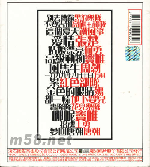01. 別去糟蹋 -黑豹樂隊(duì) 02. 不要告別 -高旗+超載 03. 這個夏天 -鐵風(fēng)箏 04. 愛情 -張楚 05. 姑娘漂亮 -何勇 06. 高級動物 -竇唯 07. 風(fēng)馬牛 -周韌 08. 一九九九年八月十日 -方科 09. 累 -紅色部隊(duì) 10. 金色的眼睛 -殤 11. 都一樣 -地下嬰兒 12. 轟隆隆 -花兒樂隊(duì) 13. 哪呢 -竇唯 14. 招魂 -王勇 15. 夢回唐朝 -唐朝