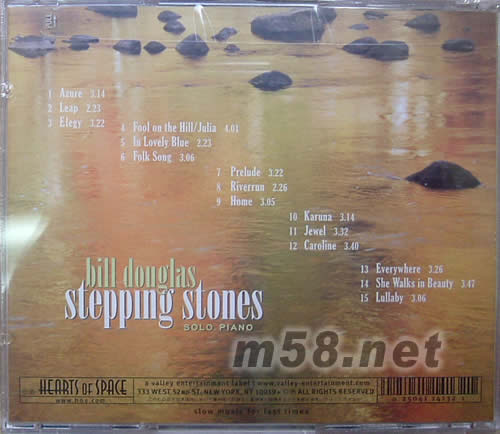 BILL DONGLAS STEPPING STONES琴弦美樂(鋼琴獨奏)(m58.net) 著名音樂大師比爾·道格拉斯(Bill Douglas)首度以純鋼琴獨奏,輕柔感性的(New Age)旋律配合如流水行云的彈奏技巧,更添上幾分柔情詩意,令樂迷耳目一新。