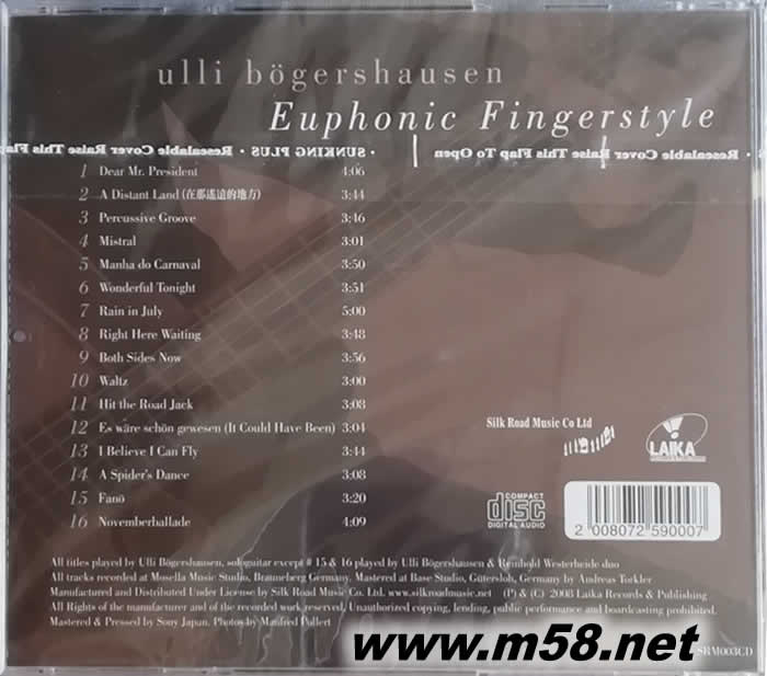 指彈的誘惑EUPHONIC FINGERSTYLE(m58.net) Ulli Bogershausen / 指彈的誘惑 精練。出神入化的吉他指彈技巧是Bogershausen 征服所有美樂追尋者的武器。他所演繹的樂曲被著名高級音響制造采用為器材示范及監聽之用,音效與音樂為頂級發燒之作,絕對可以信賴! 特別推薦:Dear Mr President / Manha de Carnaval /Wonderful Tonight /A Distant Land (在那遙遠的地方