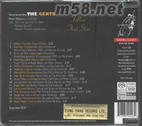 價格為估,以實到貨為準! FOLLOW THAT STAR THE GENTS SACD(m58.net) 請點看產品正、背面大圖 MADE IN GERMANY 荷蘭著名男聲合唱團“紳士男聲合唱團”(VOCALE ENSEMBLE OF GENTS)最新圣誕專輯。再以純凈高技巧之無伴奏演唱水準聞名歐洲。 SACD收錄他們由古典到現代、宗教等不同圣誕歌曲,經錄音處理后聲層分明,增添震撼力,這群紳士人聲獨一無二,合聲無與倫比,干脆不要伴奏!受到全球各大城市的邀請,法國,西班牙,匈牙利,愛爾蘭,挪威及美國,所到之處大受歡迎及合唱樂壇的評審的肯定。