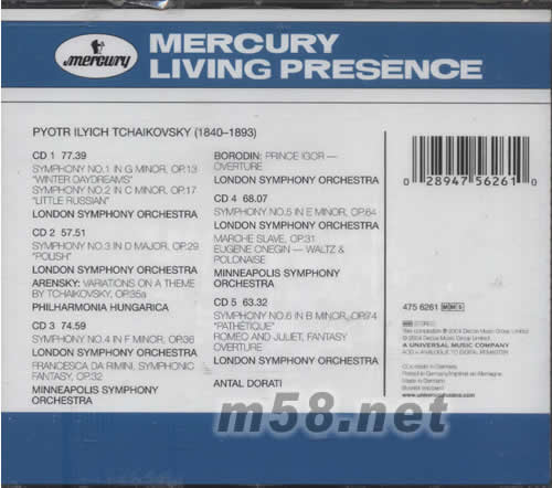 CD 1 SYMPHONY NI.1 IN G MINOR.OP.13"WINTER DAYDREAMS" SYMPHONY NO.2 IN C MINOR.OP.17 "LITTLE RUSSIAN" LONDON SYMPHONY ORCHESTRA CD 2 SYMPHONY NO.3 IN D MAJOR,OP.29 "POLISH" LONDON SYMPHONY ORCHESTRA ARENSKY:VARIATIONS ON A THEME BY TCHALKOVSKY,OP.35A PHILHARMONIA HUNGARICA CD 3 SYMPHONY NO.4 IN F MINOR,OP.36 LONDON SYMPHONY ORCHESTRA FRANCESCA DA RIMNI,SYMPHONIC FANTASY.OP.32 MINNEAPOLIS SYMPHONY ORCHESTRA BORODIN:PRINCE IGOR--OVERTURE LONDON SYMPHONY ORCHESTRA CD 4 SYMPHONY NO.5 IN E MINOR,OP.64 LONDON SYMPHONY.ROCHESTRA MARCHE SLAVE OP.31 EUGENE ONEGIN -- WALTZ & POLONAISE MINNEAPOLIS SYMPHONY ORCHESTRA CD 5 SYMPHONY NO.6 IN B MINOR,OP.74 "PATHETIQUE" ROMEO AND JULIET,FANTASY OVERTURE LOANDON SYMPHONY ORCHESTRA ANTAL DORATI