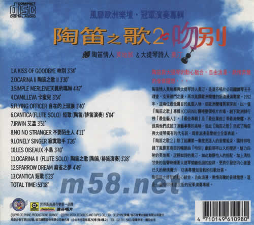 01 KISS OF GOODBYE 吻別 02 OCARINA II 陶笛之歌2 03 SIMPLE MERLENE 天真的瑪琳 04 CAMILLEVA 卡蜜兒 05 FLYING OFFICER 自在的上班族 06 CAMTOCA(FLUTE SOLO) 短歌 07 IRWIN 艾溫 下載 電信網(wǎng)通VIP 08 NO NO STRANGER 不要陌生人 09 LONELY SINGER 寂寞歌手 10 LES OISEAUX 小鳥 11 OCARINA II(FLUTE SOLO)陶笛之歌2 12 SPARROW DREAM 麻雀之夢 13 CANTICA 短歌