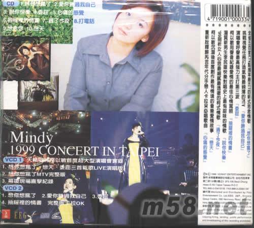 VCD1 天籟唱將柯以敏首度超大型演唱會寶錄 1、想你想瘋了,戀天、委屈三首新歌LIVE演唱版 2、想你想瘋了MTV完整版 3、幕后現(xiàn)場直播紀(jì)錄 VCD2 1、想你想瘋了 2、愛你勝過我自己 3、委屈 4、抽屜里的情書 完整版卡拉OK
