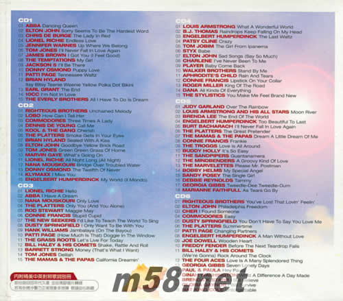 CD1 1.Dancing Queen - Abba / 舞后 – 阿巴合唱團(tuán) 2.Sorry Seems To Be The Hardest Word – Elton John / 抱歉成為最難啟齒的話語 – 艾爾頓強(qiáng) 3.The Lady In Red - Chris De Burge / 紅衣女郎 - 克里斯迪博 4.Endless Love - Lionel Richie / 無盡的愛 - 萊諾李奇 5.Up Where We Belong - Jennifer Warnes / 飛向我們的歸屬 - 珍妮佛華恩斯 6.I'll Never Fall In Love Again - Tom Jones /我永遠(yuǎn)不會(huì)再次陷入情網(wǎng) - 湯姆瓊斯 7.I Got You - James Brown / 我擁有你 - 詹姆士布朗 8.My Girl - The Temptations / 我的女孩 - 誘惑合唱團(tuán) 9.I'll Be There - Jackson 5 / 我會(huì)在你身邊 - Jackson 5 10.Puppy Love - Donny Osmond / 純純的愛 - 唐尼奧斯蒙 11.Tennessee Waltz - Patti Page / 田納西華爾滋 - 佩蒂佩吉 12.Itsy Bitsy Teenie Weenie Yellow Polka Dot Bikini - Brian Hyland / 超迷你黃點(diǎn)比基尼 - 布萊恩海蘭德 13.The End – Earl Grant / 盡頭 – 厄爾葛蘭特 14.I'm Not In Love – 10cc / 我沒有墜入愛河 – 10cc 15.All I Have To Do Is Dream – The Everly Brothers / 只有夢(mèng)里尋 - 艾佛利兄弟 CD2 1.Unchained Melody - Righteous Brothers / 自由的旋律 - 正義兄弟 2.How Can I Tell Her - Lobo / 我要如何告訴她 - 灰狼羅柏 3.Three Times A Lady - Commodores / 三生三世的戀人 - 海軍準(zhǔn)將合唱團(tuán) 4.Call Me - Dennis De Young / 打給我 - 丹尼斯狄楊 5.Cherish - Kool & The Gang / 珍惜 - 庫爾伙伴合唱團(tuán) 6.Smoke Gets In Your Eyes - The Platters / 煙霧迷濛了妳的眼 - 五黑寶合唱團(tuán) 7.Sealed With A Kiss - Brian Hyland / 以吻風(fēng)箋 - 布萊恩海蘭德 8.Goodbye Yellow Brick Road - Elton John / 再見了黃磚路 - 艾爾頓強(qiáng) 9.Green Green Grass Of Home - Tom Jones / 碧草如茵的家園 - 湯姆瓊斯 10.What’s Going On - Marvin Gaye / 怎么一回事 - 馬文蓋 11.All Night Long - Lionel Richie / 狂歡一整晚 - 萊諾李奇 12.Bridge Over Troubled Water - Nana Mouskouri / 惡水上的大橋 - 娜娜 13.The Twelfth Of Never - Donny Osmond / 天長(zhǎng)地久 - 唐尼奧斯蒙 14.I Miss You - Klymaxx / 我想念你 - 克萊麥斯合唱團(tuán) 15.My World - Engelbert Humperdinck / 這個(gè)世界 - 英格伯漢普汀克 CD3 1.Hello - Lionel Richie / 哈羅 - 萊諾李奇 2.Have A Dream – Abba / 世人有夢(mèng) - 阿巴合唱團(tuán) 3.Only Love - Nana Mouskouri / 唯一的愛 - 娜娜 4.Only You - The Platters / 只有你 - 五黑寶合唱團(tuán) 5.Maggie May - Rod Stewart / 瑪姬 - 洛史都華 6.Stupid Cupid - Connie Francis / 呆呆邱比特 - 康妮法蘭西絲 7.I'd Like To Teach The World To Sing - The New Seekers / 大伙一起唱支歌 - 夢(mèng)想家合唱團(tuán) 8.I Only Want To Be With You - Dusty Springfield / 我只想你在身邊 - 達(dá)斯汀史普林菲爾德 9.Jambalaya - Hank Williams / 河上的什錦飯 - 漢克威廉斯 10.Doggie In The Window - Patti Page / 櫥窗內(nèi)的狗 - 佩蒂佩吉 11.Let's Live For Today – The Grass Roots / 活在當(dāng)下 - 草根合唱團(tuán) 12.Shake, Rattle And Roll - Bill Haley & His Comets / 搖阿碰阿轉(zhuǎn)阿 - 比爾哈雷與彗星樂隊(duì) 13.Money - Barrett Strong/ 我要的只是錢 - 巴瑞特史特隆 14.Delilah - Tom Jones / 迪來拉 - 湯姆瓊斯 15.California Dreamin’ - The Mamas & The Papas / 加州夢(mèng) - 媽媽與爸爸合唱團(tuán) CD4 1.What A Wonderful World - Louis Armstrong / 美麗世界 - 路易斯阿姆斯壯 2.Raindrops Keep Falling On My Head - B.J. Thomas / 雨點(diǎn)滴落我頭上 - 比杰湯瑪斯 3.The Last Waltz - Engelbert Humperdinck / 最后華爾滋 - 英格伯漢普汀克 4.Crazy - Patsy Cline / 為愛瘋狂 - 佩西克萊恩 5.The Girl From IpanemaTom Jobim / 伊帕內(nèi)瑪姑娘 - 湯姆裘賓 6.Babe - Styx / 寶貝 - 冥河合唱團(tuán) 7.Sad Songs - Elton John / 悲傷的歌 - 艾爾頓強(qiáng) 8.I’ve Never Been To Me - Charlene / 從不屬於我自己 - 夏琳 9.Baby Come Back - Player / 回到我身邊 - 玩家合唱團(tuán) 10.Stand By Me - Walker Brothers / 常伴左右 - 沃克兄弟 11.Rain And Tears - Aphrodite's Child / 雨和淚 - 愛神之子 12.Lipsitck On Your Collar - Connie Francis / 衣領(lǐng)上的口紅印 - 康妮法蘭西絲 13.King Of The Road - Roger Miller / 公路之王 - 羅杰米勒 14.All Kinds Of Everything - Dana / 所有的所有 - 唐娜 15.You Make Me Feel Brand New - The Stylistics / 是你使我清新 - 學(xué)體合唱團(tuán) CD5 1.Over The Rainbow - Judy Garland / 彩虹之上 - 茱蒂嘉蘭 2.Moon River - Louis Armstrong And His All Stars / 月河 - 路易斯阿姆斯壯群星會(huì) 3.The End Of The World - Brenda Lee / 世界末日 - 布蘭達(dá)李 4.Too Beautiful To Last - Engelbert Humperdinck / 留不住的美好 - 英格柏漢普汀克 5.I'll Never Fall In Love Again - Burt Bacharach / 愛情止步 - 伯特巴卡洛克 6.The Great Pretender - The Platters / 偽裝達(dá)人 - 五黑寶合唱團(tuán) 7.Dream A Little Dream Of Me - The Mamas & The Papas / 多夢(mèng)我一些 - 媽媽與爸爸合唱團(tuán) 8.Frankie - Connie Francis / 法蘭奇 - 康妮法蘭西絲 9.Love Is All Around - The Troggs / 愛無所不在 - 穴居人合唱團(tuán) 10.It’s So Easy - Buddy Holly / 愛,如此容易 - 巴弟哈利 11.Guantanamera - The Sandpipers / 關(guān)達(dá)拉美拉 - 知更鳥樂團(tuán) 12.A Groovy Kind Of Love - The Mindbenders / 愛最珍貴 - 心靈殺手合唱團(tuán) 13.Please Mr. Postman - The Marvelettes / 郵差先生請(qǐng)等等 - 奇蹟合唱團(tuán) 14.My Special Angel - Bobby Helms / 專屬天使 - 巴比賀爾姆斯 15.The Single Girl - Sandy Posey / 單身女子 - 莎迪波斯 16.Tammy - Debbie Reynolds / 黛咪 - 黛比雷諾 17.Tweedle-Dee Tweedle-Dum – Georgia Gibbs / 叮叮噹噹 - 喬琪亞吉布斯 18.As Tears Go By - Marianne Faithfull / 熱淚盈眶 - 瑪莉安菲絲佛 CD6 1.You'v