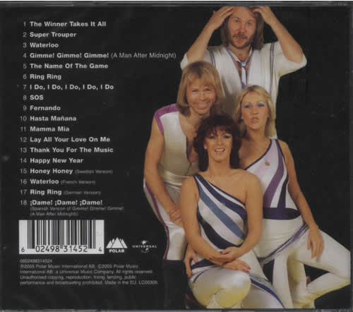 01. The Winner Takes It All 02. Super Trouper 03. Waterloo 04. Gimme!Gimme!Gimme!(A Man After Midnight) 05. The Name Of The Game 06. Ring Ring 07. I Do,I Do,I Do,I Do 08. SOS 09. Fernando 10. Hasta Manana 11. Mamma Mia 12. Lay All Your Love On Me 13. Thank You For The Music 14. Happy New Year 15. Honey Honey(Swedish Version) 16. Waterloo(French Version) 17. Ring Ring(German Version) 18. īDame!īDame!īDame!(Spanish Version of Gimme!Gimme!Gimme!(A Man After Midnight))