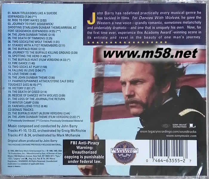 DANCES WITH WOLVES與狼共舞原聲碟(m58.net) John Barry是當代最具代表性的大師級電影音樂家之一,曾以<冬之 獅>,<獅子與我>,<遠離非洲>和<與狼共舞>獲得四座奧斯卡最佳原著音樂金像獎,<獅子與我>的”Born Free”并獲得金像獎最佳原著歌曲獎,他的早期配樂作品以007系列最為膾炙人口,鮮明的音樂形象與歷久不衰的流傳魅力,比美Ennio Morricone的流浪鏢客與John Williams的銀河戰史,近期的作品則轉變成細膩唯美的浪漫史詩風格,如<似曾相識>,<遠離非洲>和<與狼共舞>等,不僅在各項電影音樂獎項上大有斬獲, 也成為唱片巿場上歷久不衰的長青專輯.大致上來說,我們也的確可以將John Barry的作品區分成早期的爵士音樂,與近期的唯美管弦兩種典型風格。
